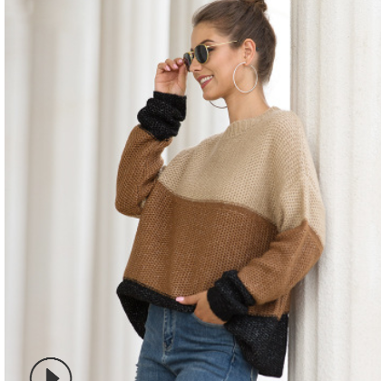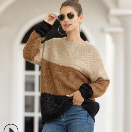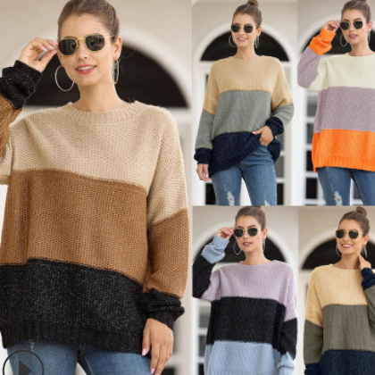 2020秋冬新品歐美時尚條紋拼色套頭毛衣女亞馬遜爆款粗線針織衫