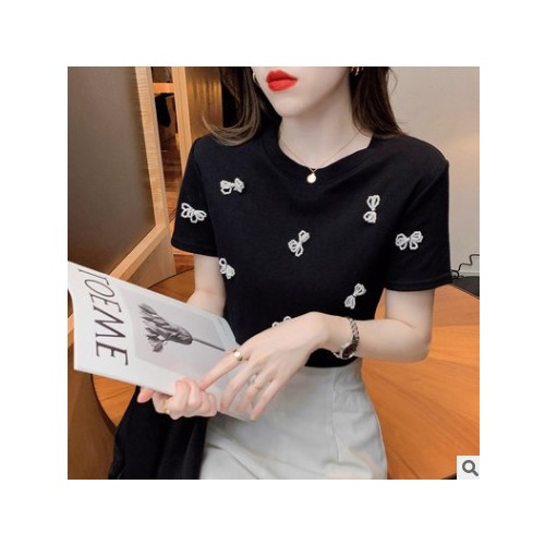 一件代發短款繡花短袖t恤女夏季女裝修身顯瘦ins潮體恤設計感上衣