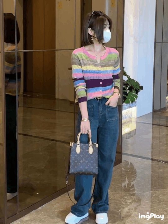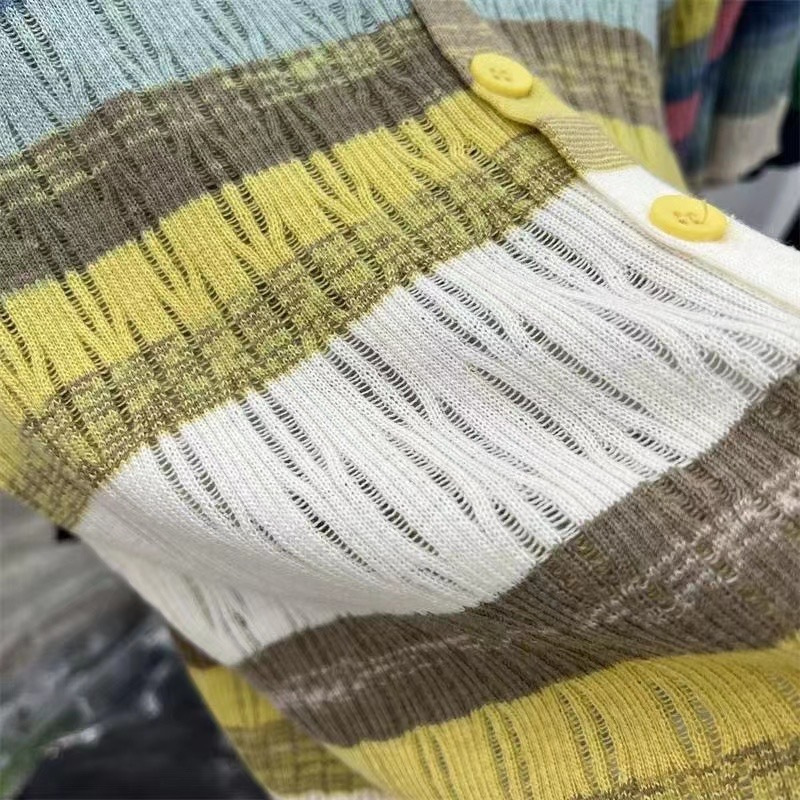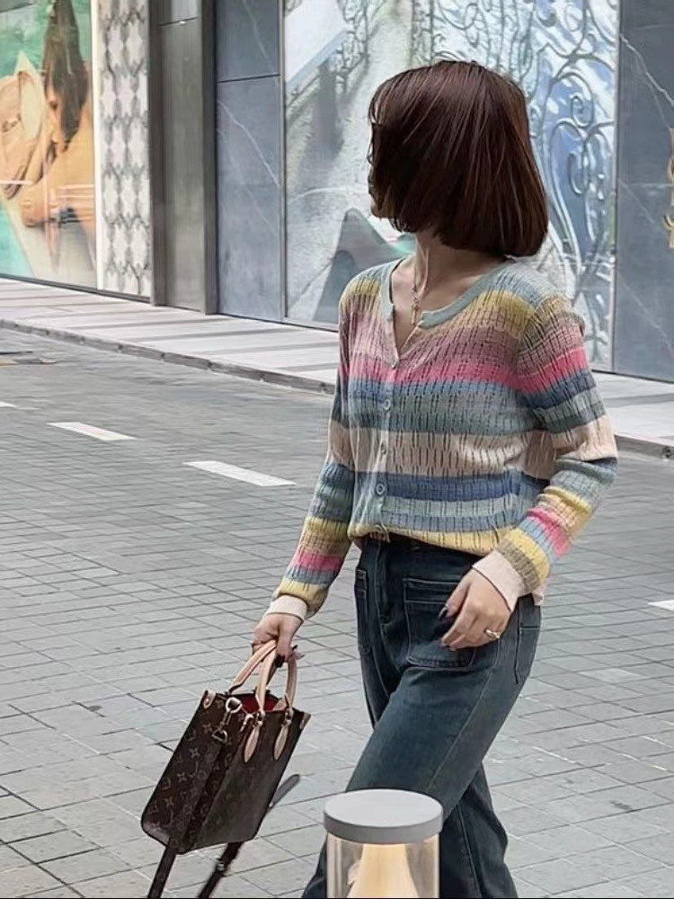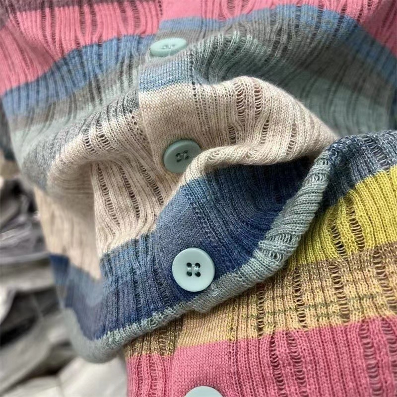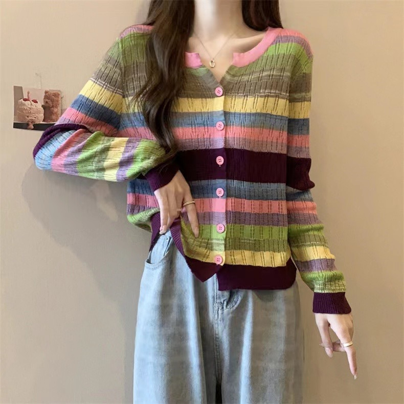 多巴胺彩色條紋針織衫秋季顯瘦長(zhǎng)袖鏤空撞色毛衣彩虹開衫寬松外套