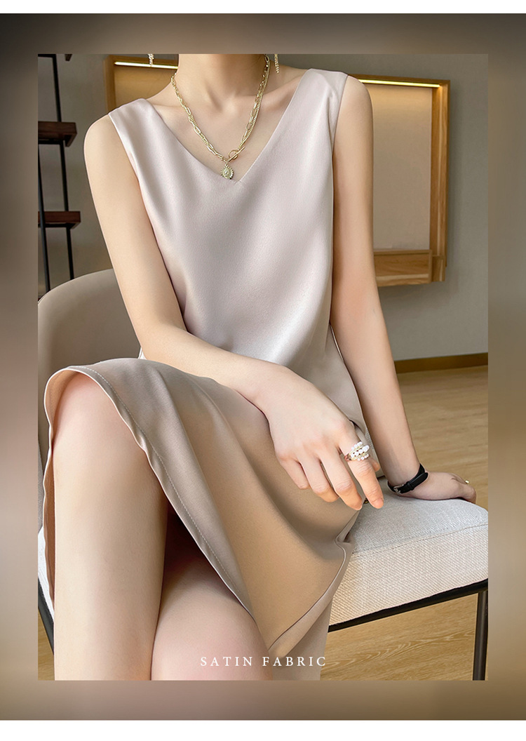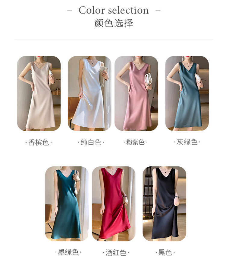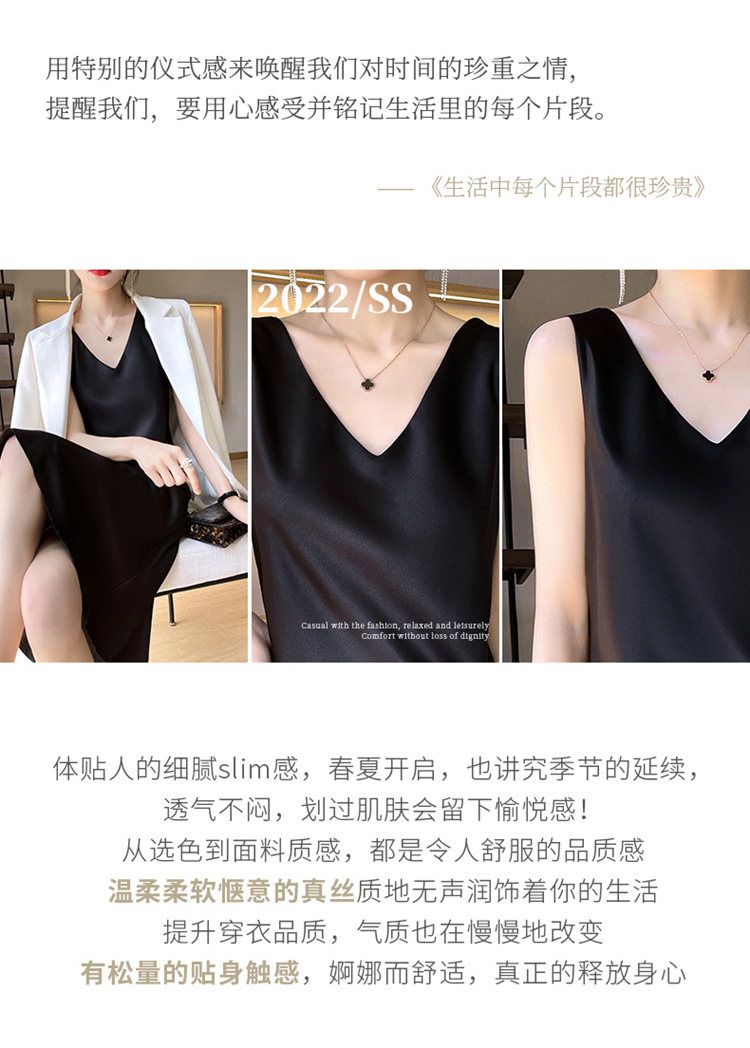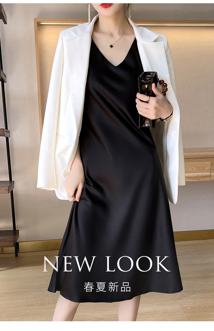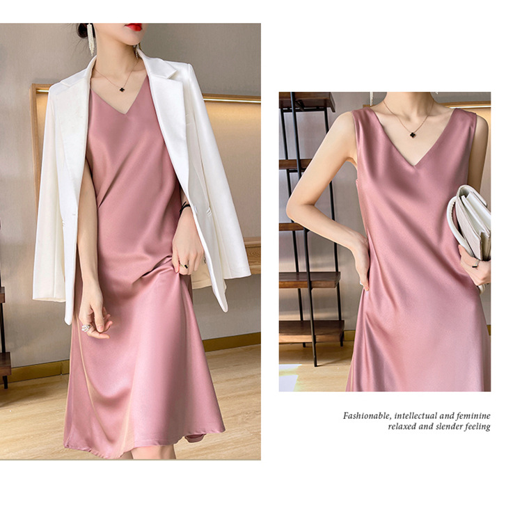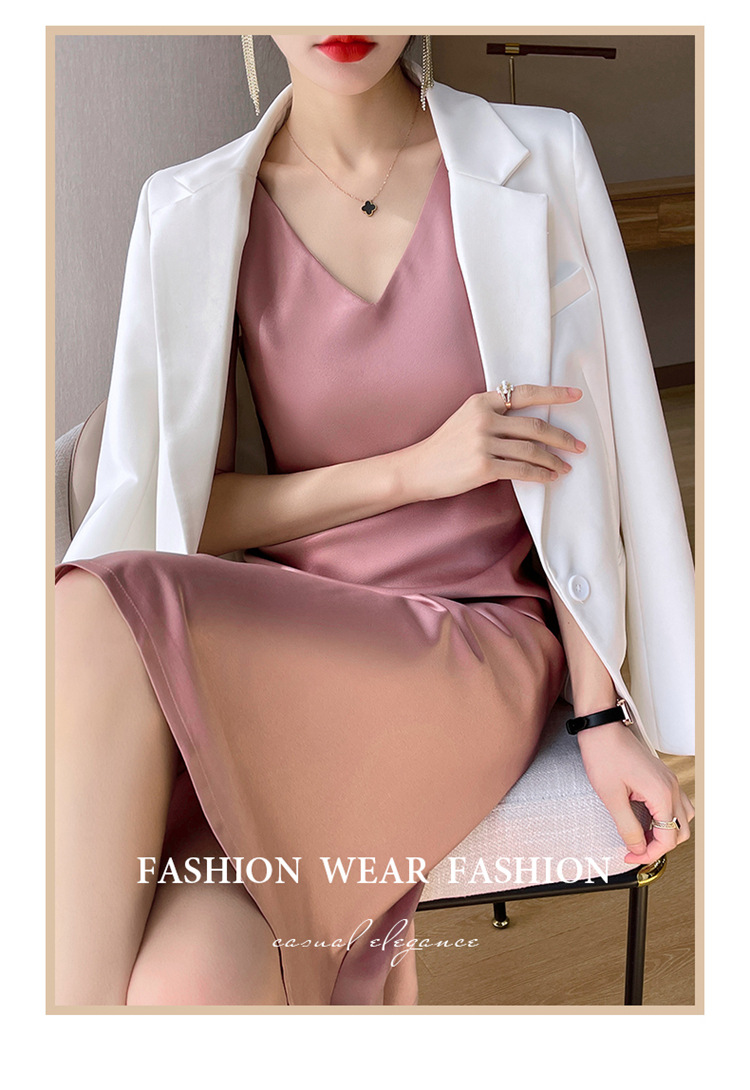 絲綢緞面2024春夏季女裝新款v字領純色寬肩西裝內搭上衣長裙吊帶