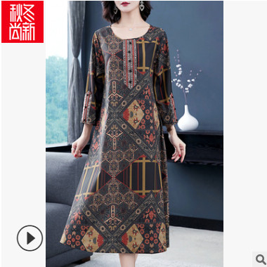 外貿中年媽媽裝印花裙子2019秋季新品寬松復古女裝潮款減齡連衣裙