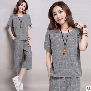 批發(fā)褲套裝韓版2018年夏季短袖亞麻拼貼/拼接成人時尚休閑套裝