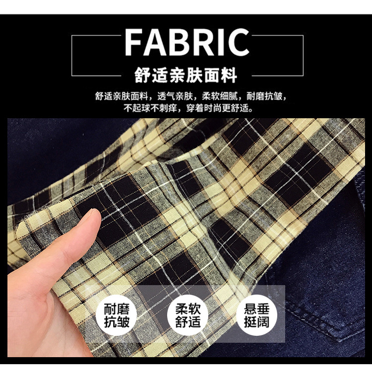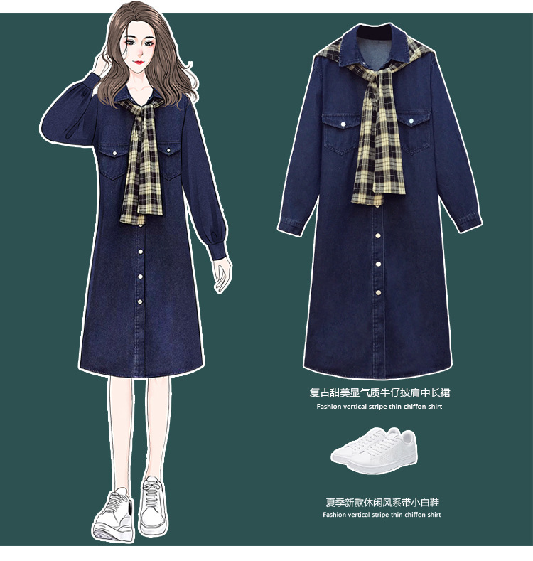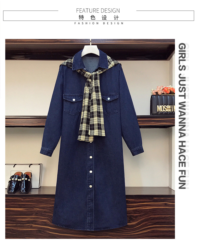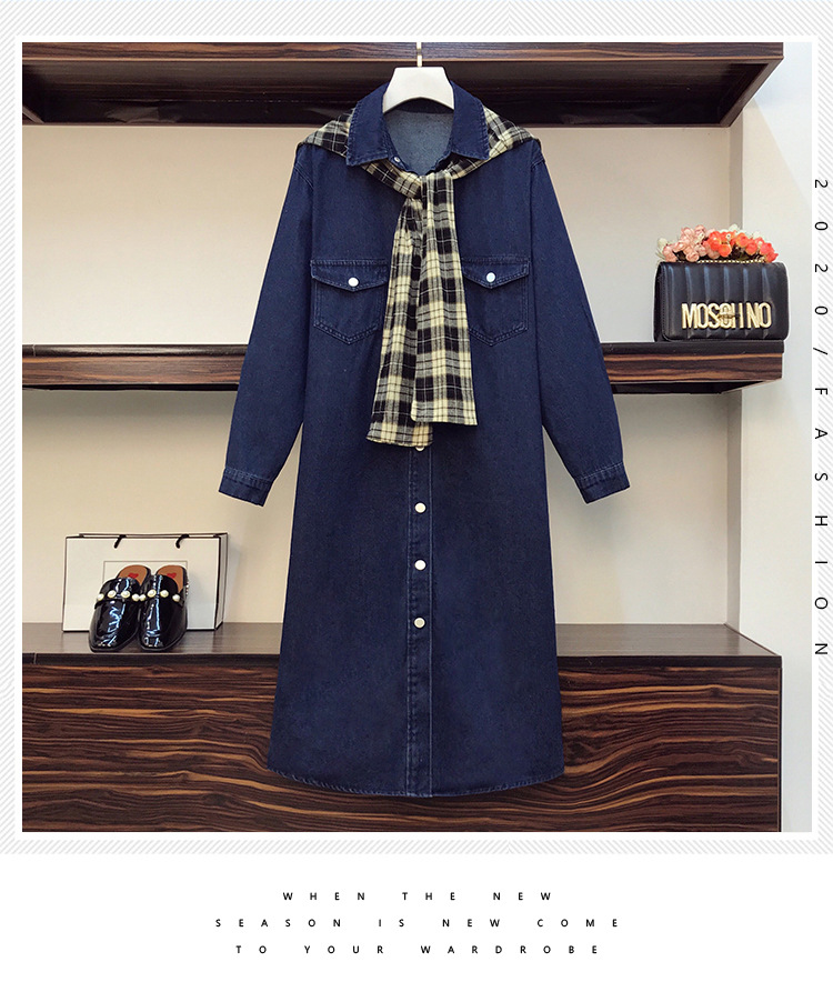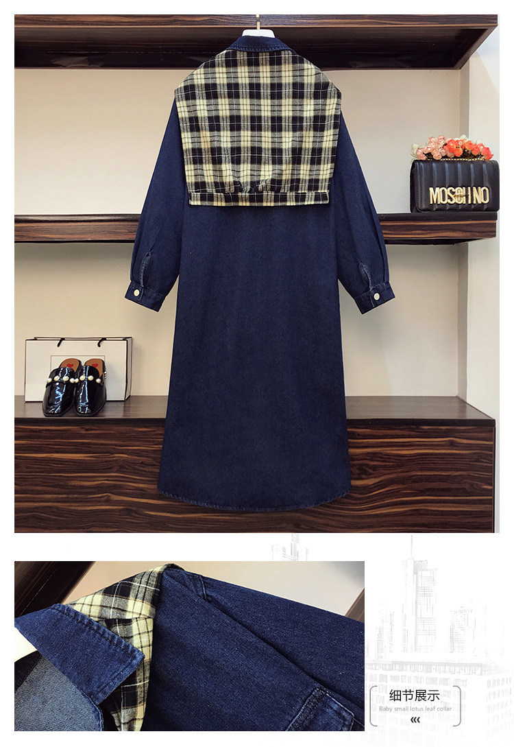 2021春裝新款大碼女裝胖MM時尚格子拼肩配中長款牛仔連衣裙兩件套