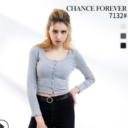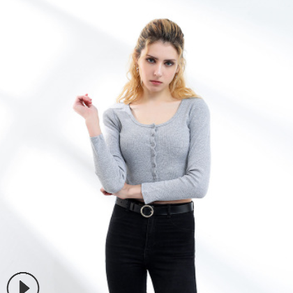 7132#新款秋冬女士長袖打底衫螺紋棉圓領多扣短款修身長袖T