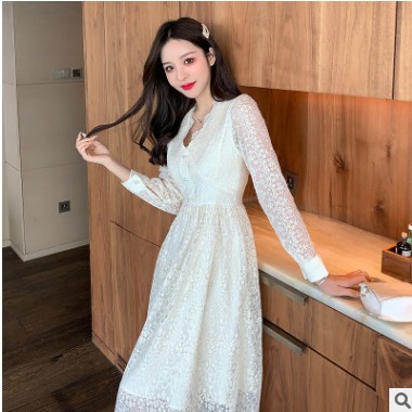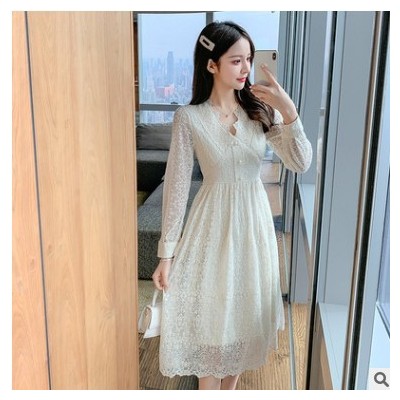 小香風(fēng)蕾絲連衣裙女氣質(zhì)2021年春季新款法式V領(lǐng)長(zhǎng)袖收腰顯瘦a字裙