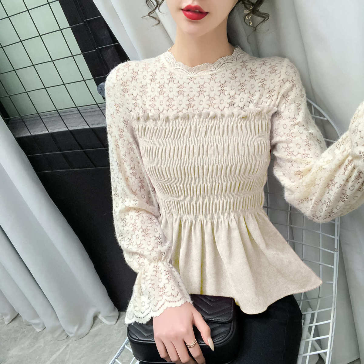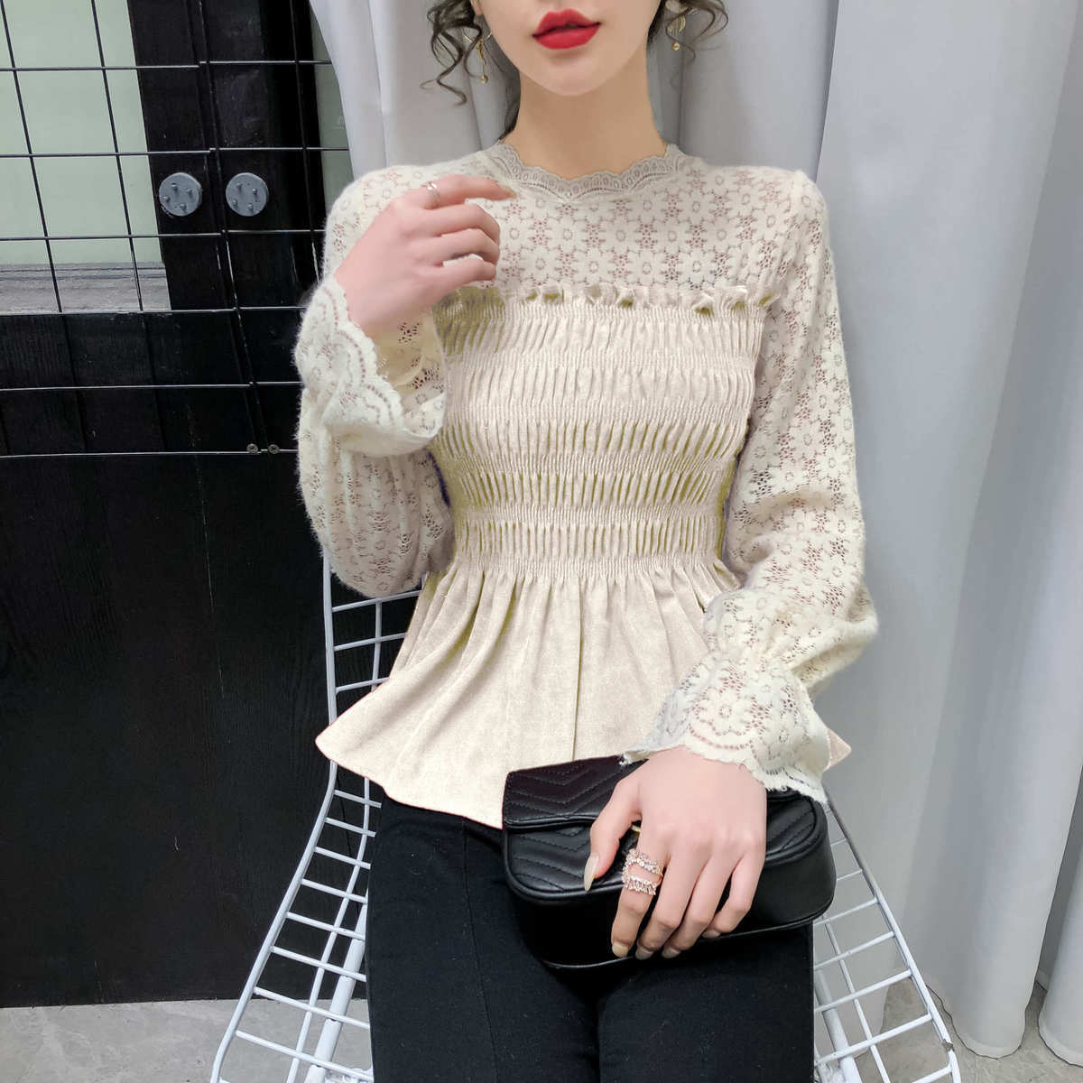 2021早春新款洋氣顯瘦收腰顯瘦設計感上衣女蕾絲拼接長袖襯衫女裝