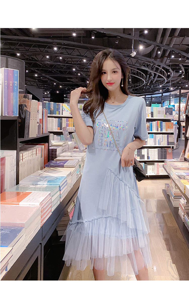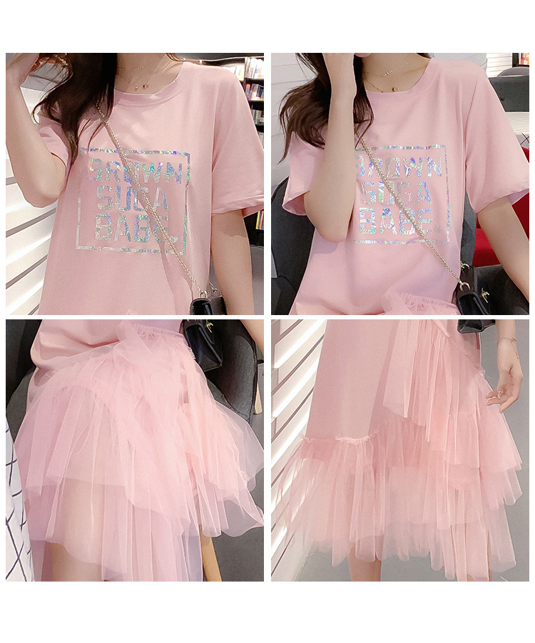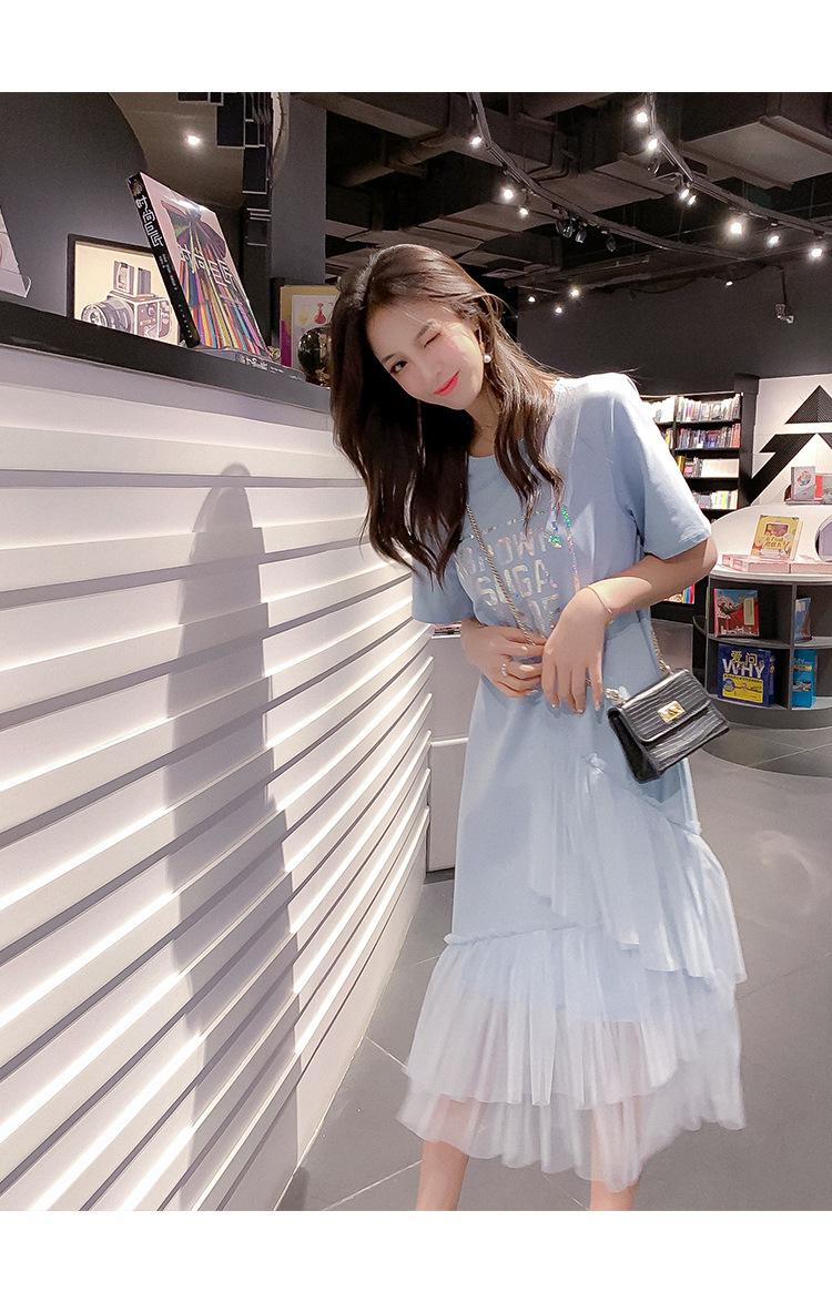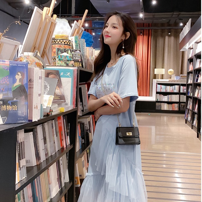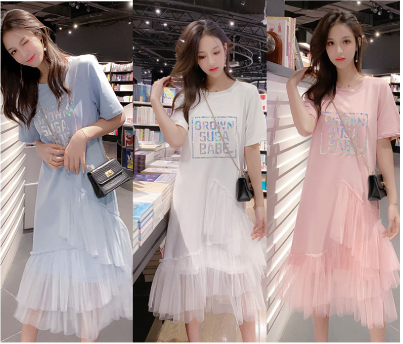 2021新款流行夏天裙子拼接網紗蛋糕T恤連衣裙女仙女蓬蓬裙夏長裙