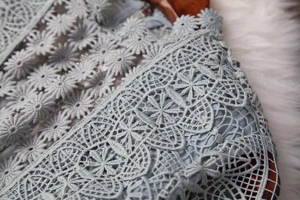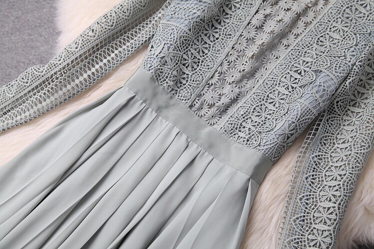 2019春季女裝新款水溶蕾絲拼雪紡百褶禮服裙開叉大擺連衣裙