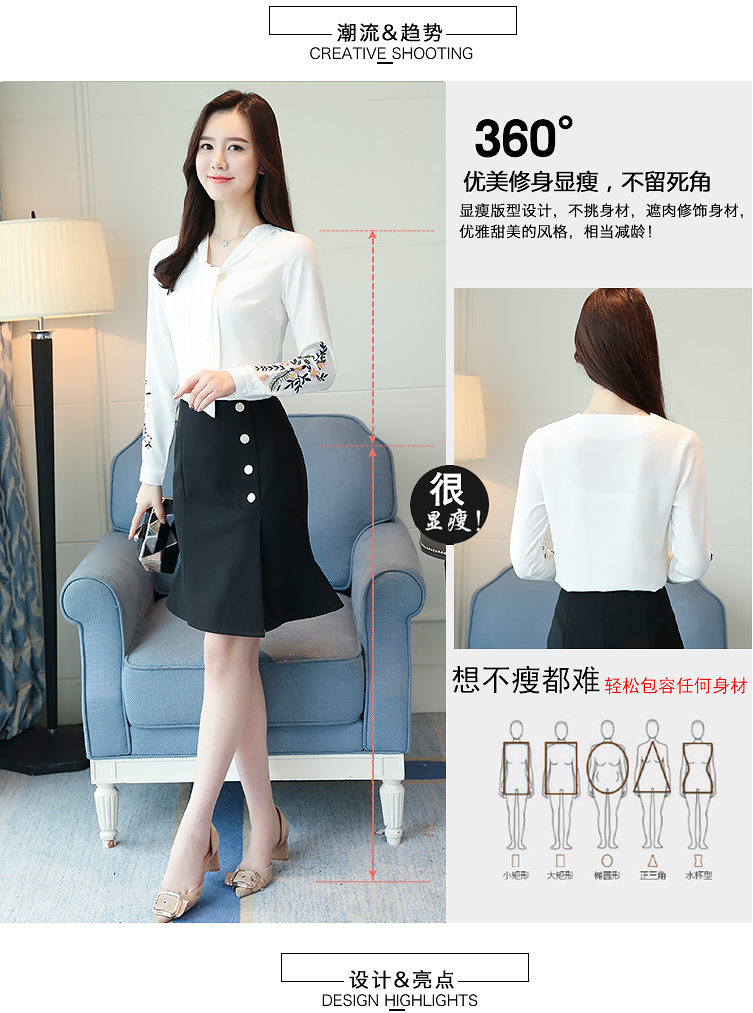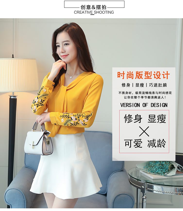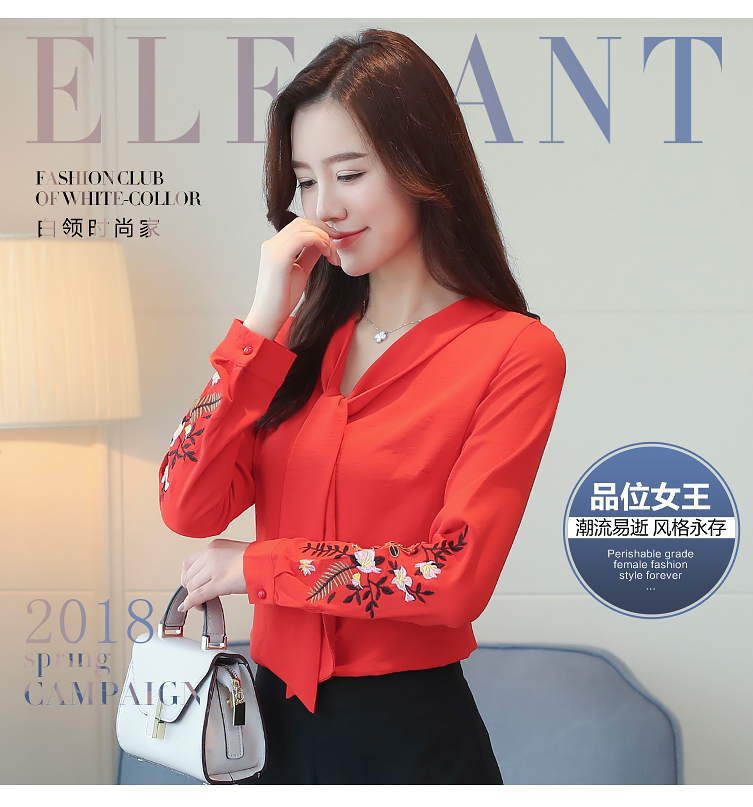 2018春季新款時尚韓版修身顯瘦V領系帶長袖繡花打底衫氣質雪紡衫