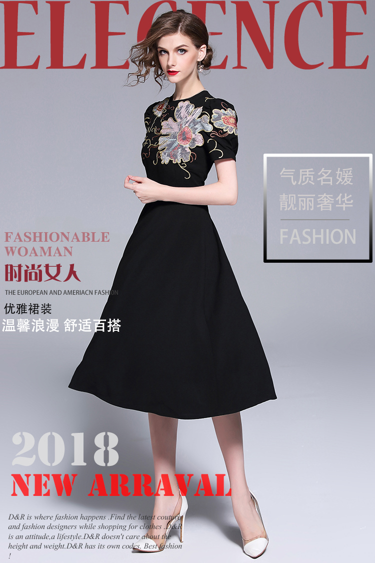 2018夏季女裝新款時尚歐美外貿wish爆款修身中長款重工刺繡連衣裙