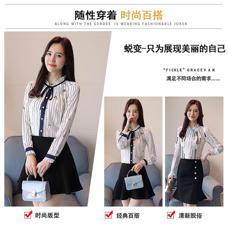 2018春季新款時尚韓版修身顯瘦荷葉邊印花雪紡衫立領女式打底襯衫