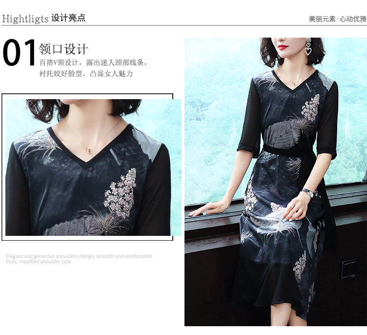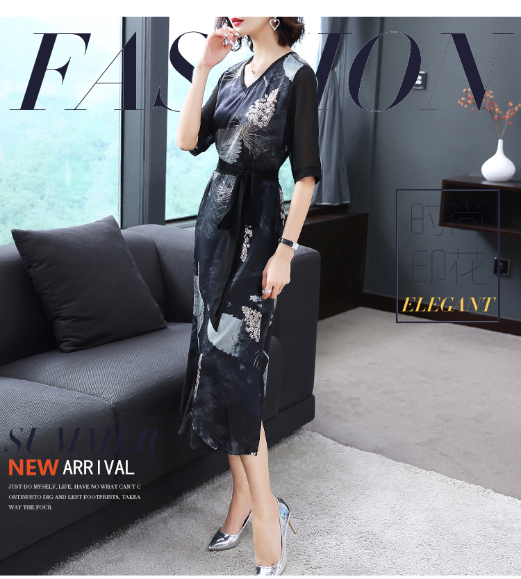 2018夏季新款時(shí)尚大牌歐美外貿(mào)女裝修身V領(lǐng)水墨印花中長款連衣裙