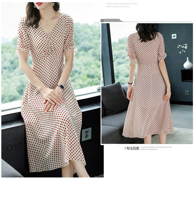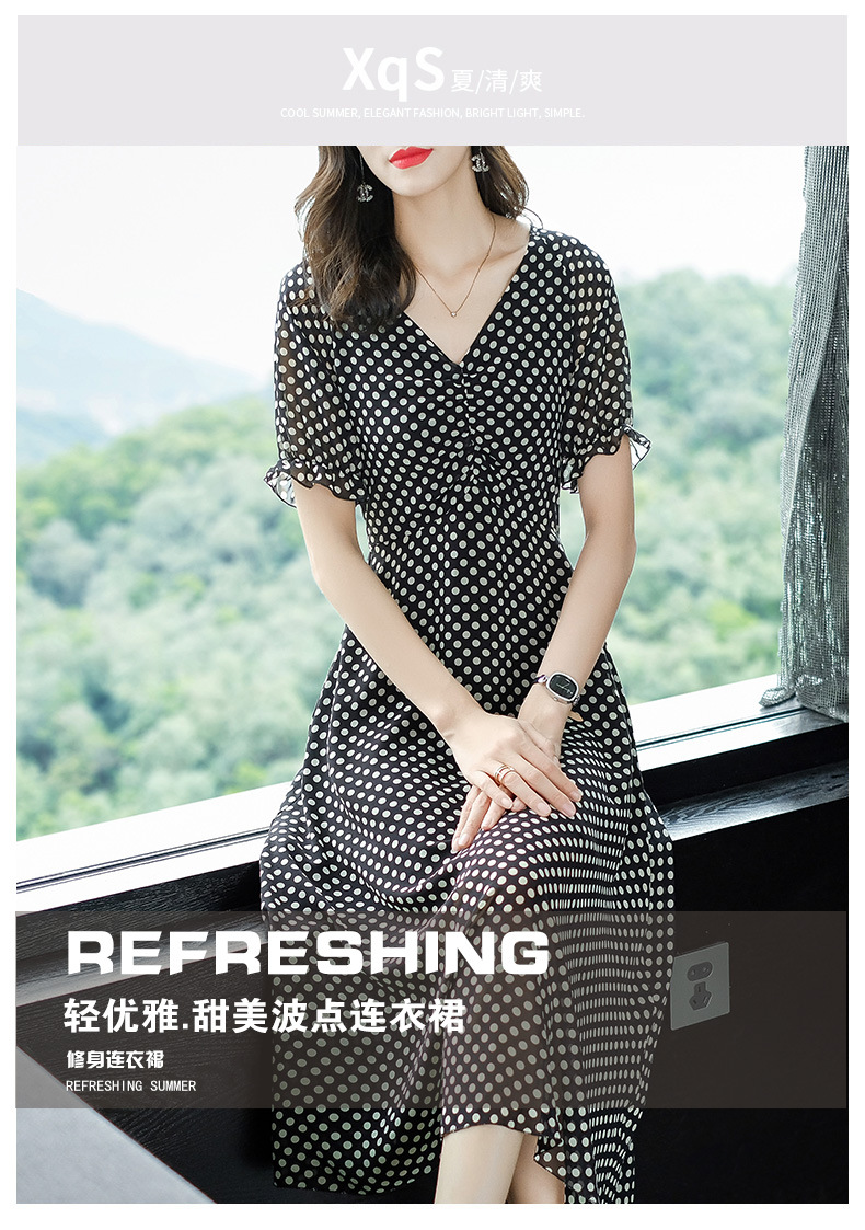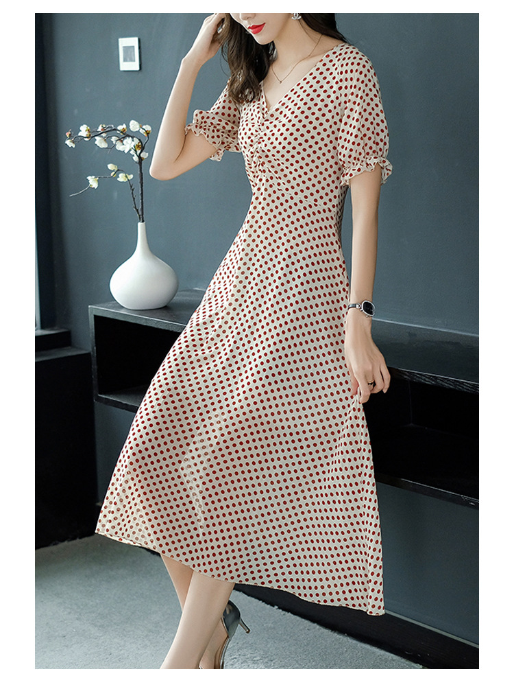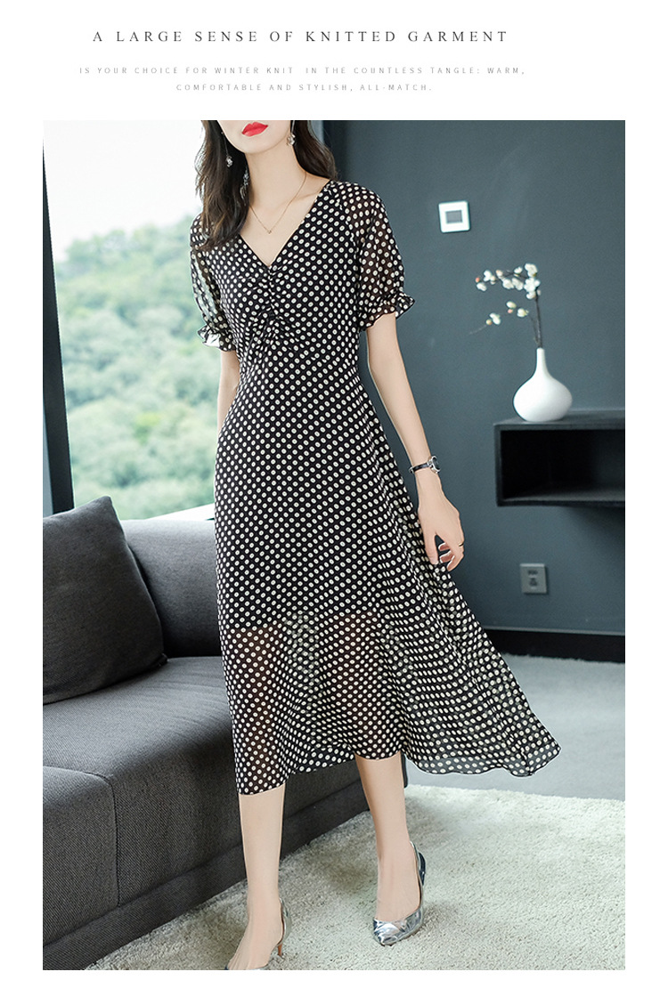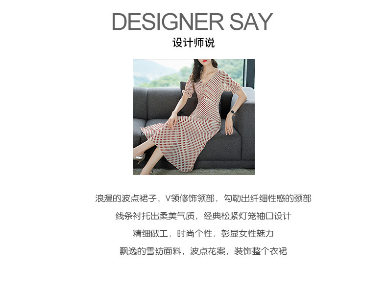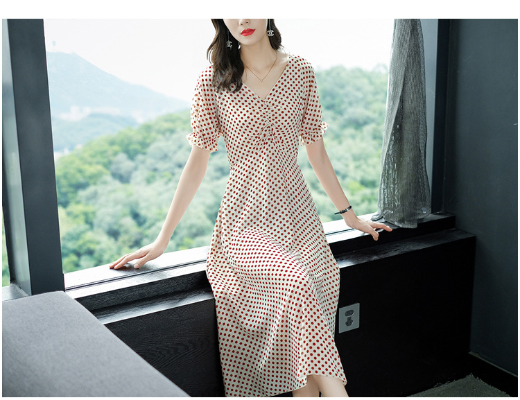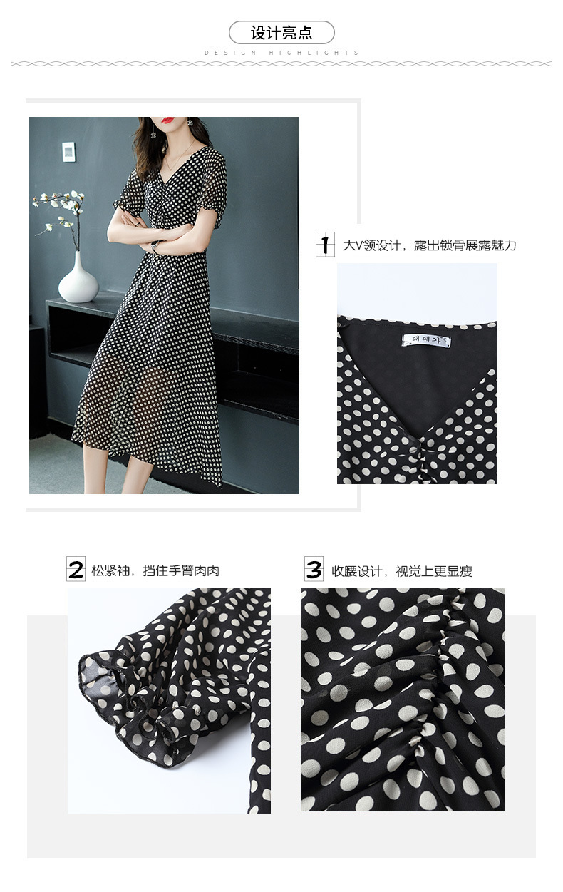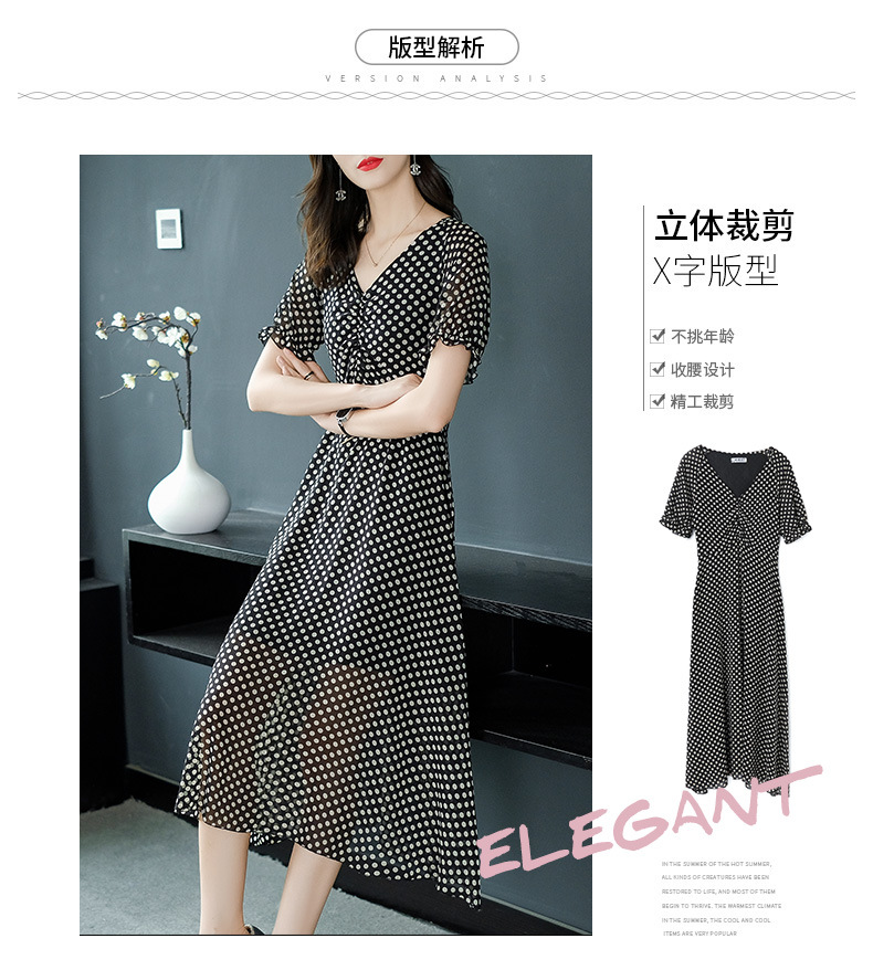 2019春夏新款洋氣質高腰V領中長款裙子chic波點連衣裙顯瘦仙女裙