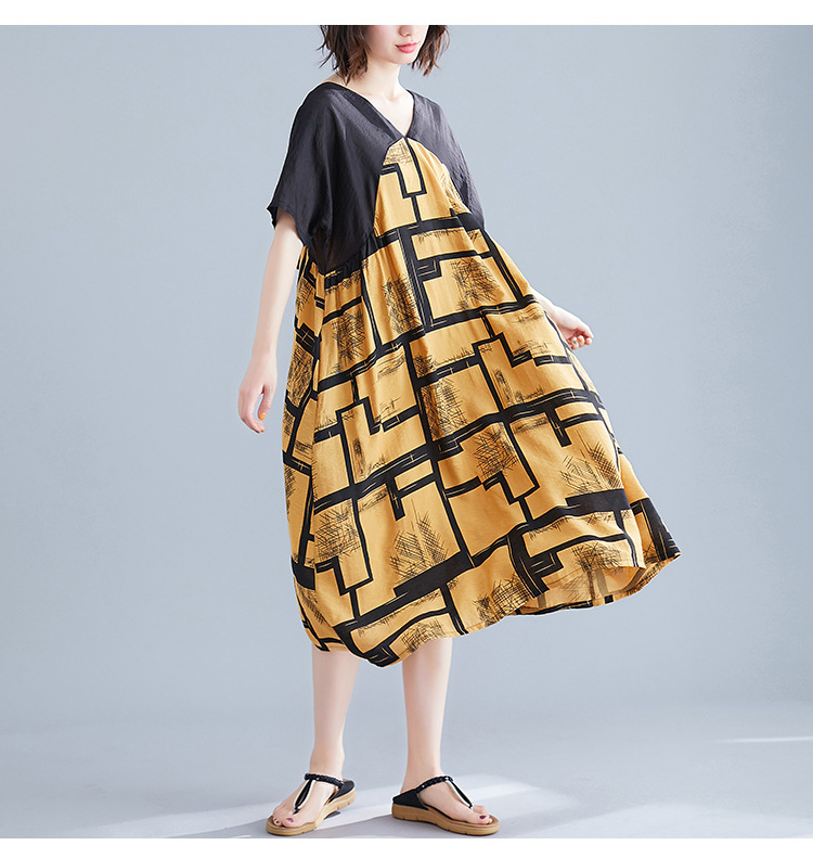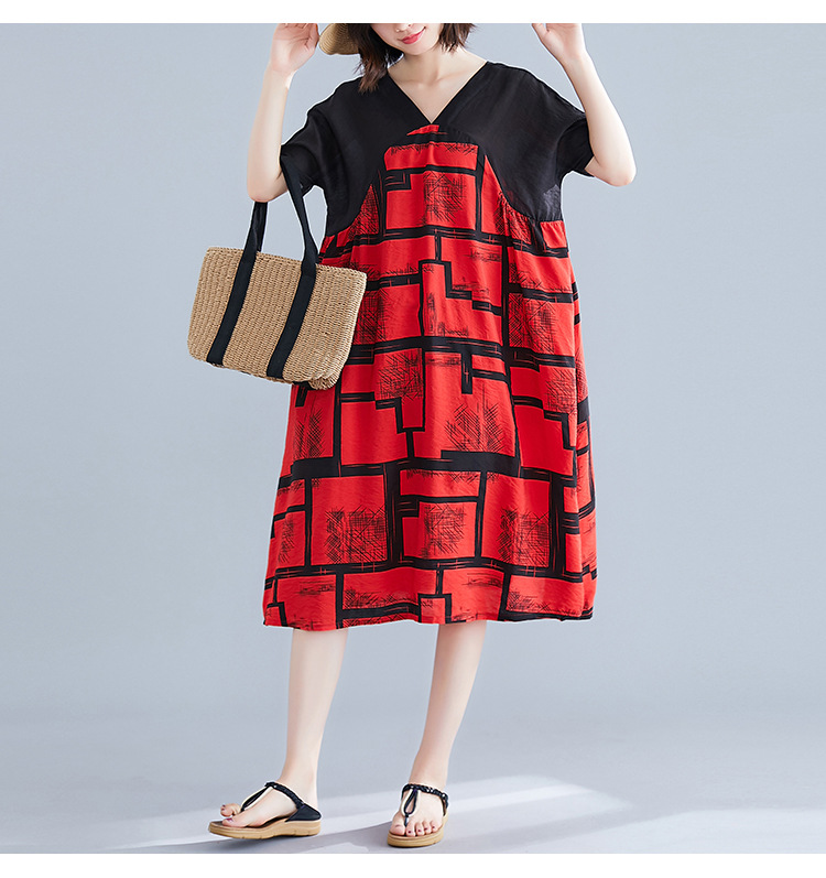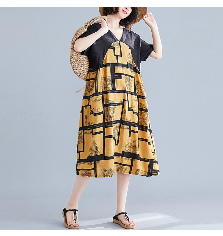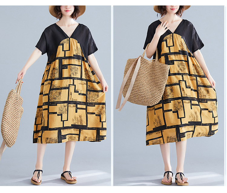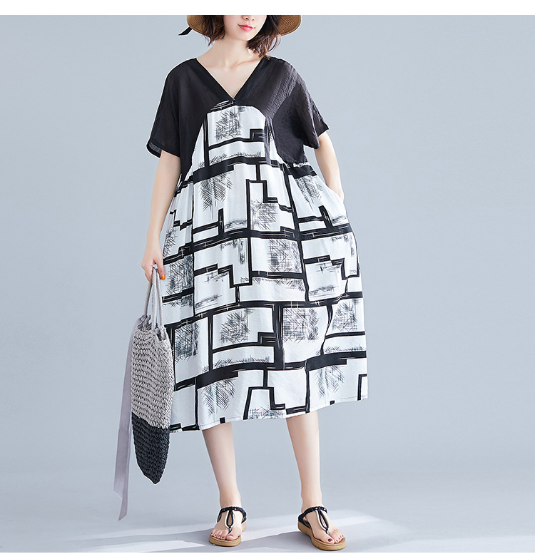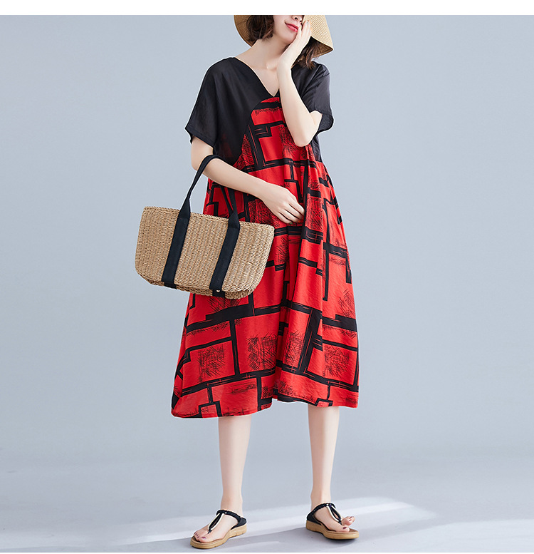 2019夏裝新款韓版文藝大碼女裝V領寬松棉麻印花拼接中長款連衣裙