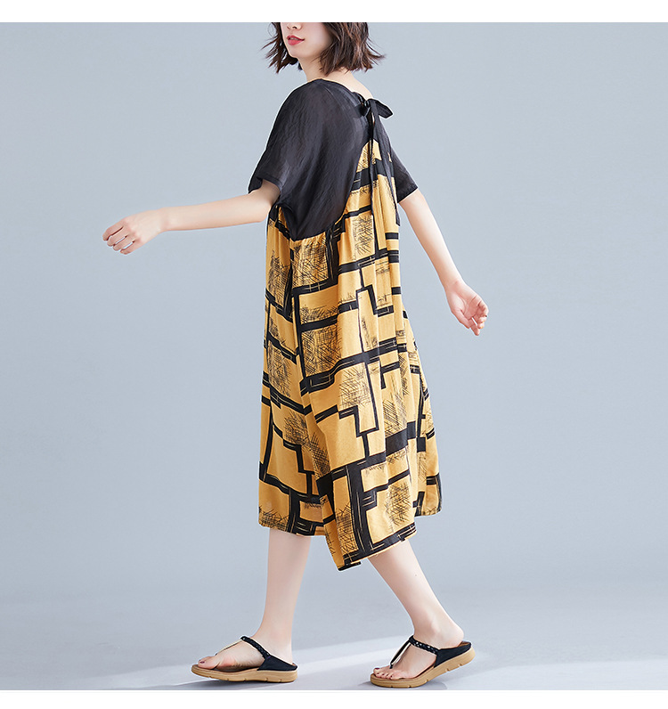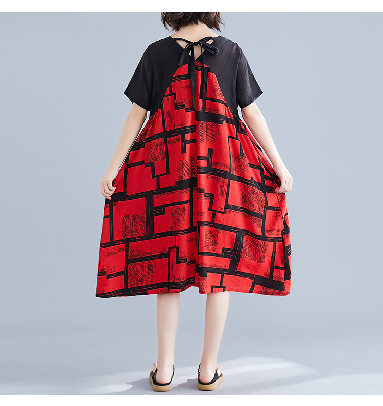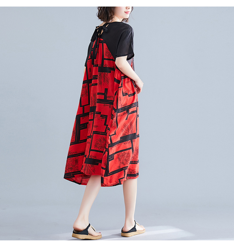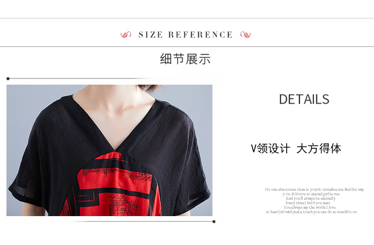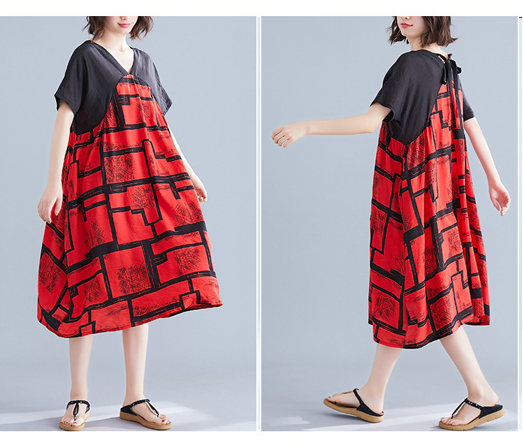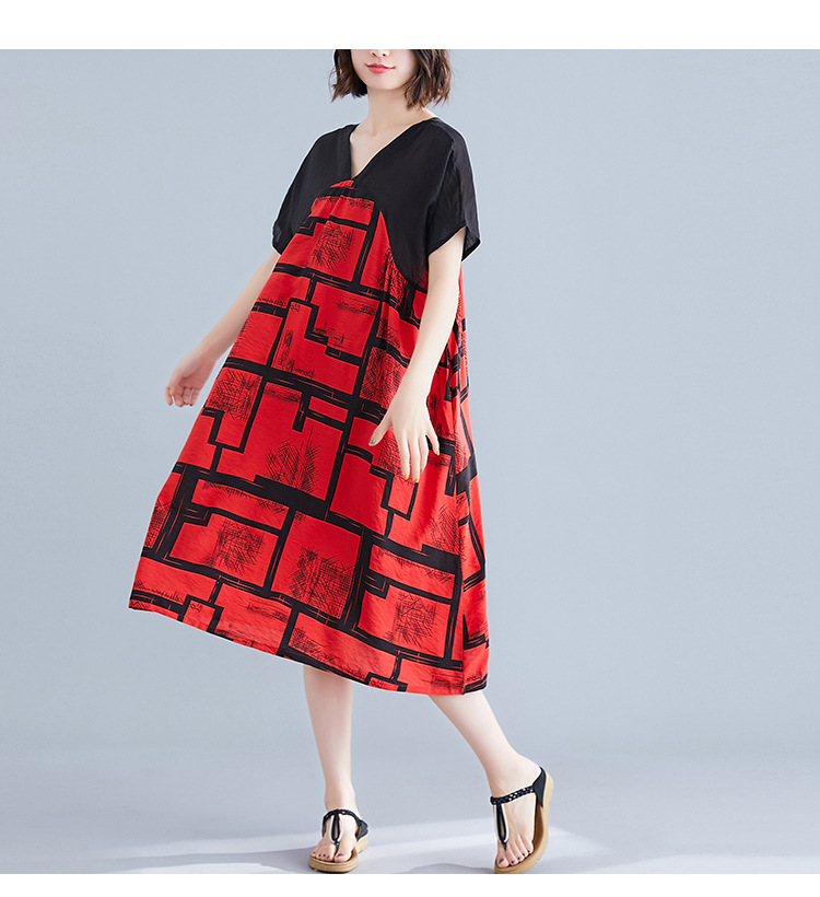 2019夏裝新款韓版文藝大碼女裝V領寬松棉麻印花拼接中長款連衣裙