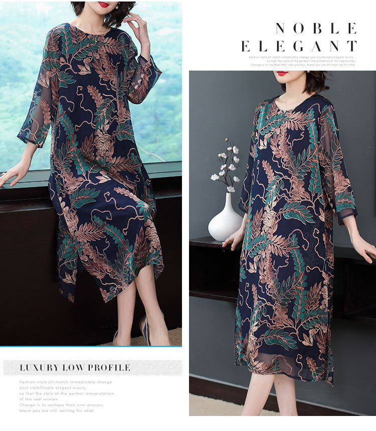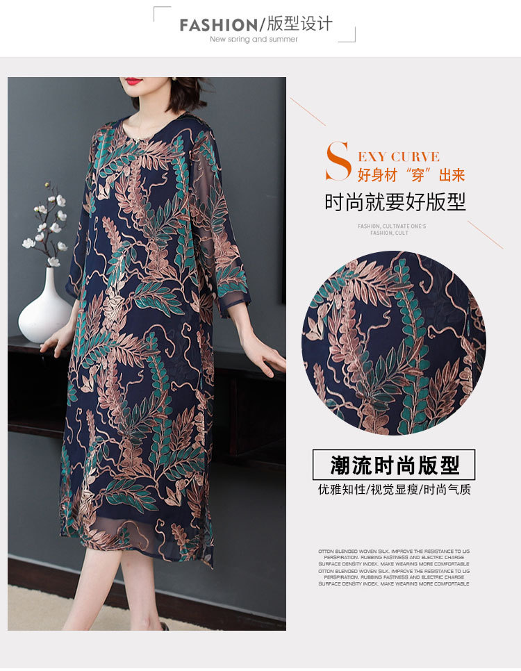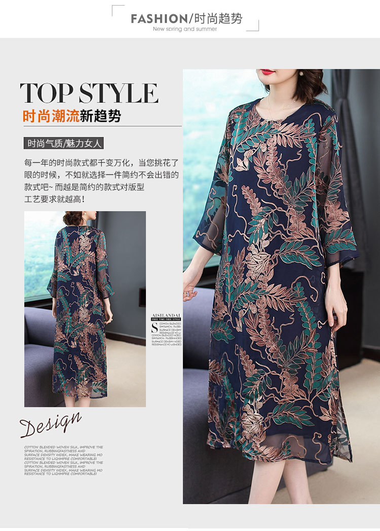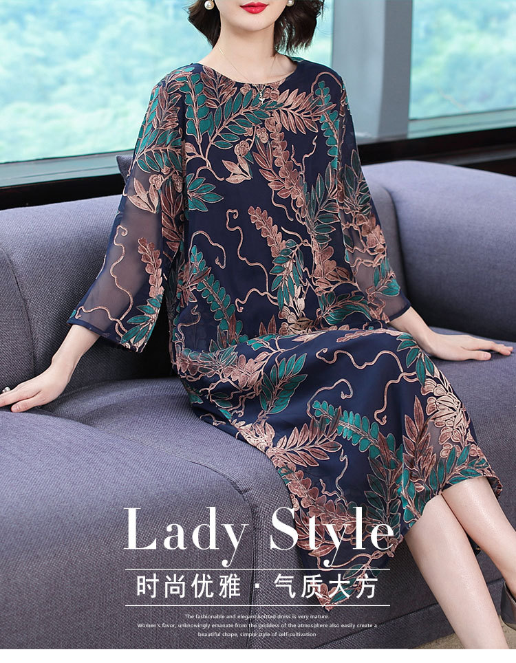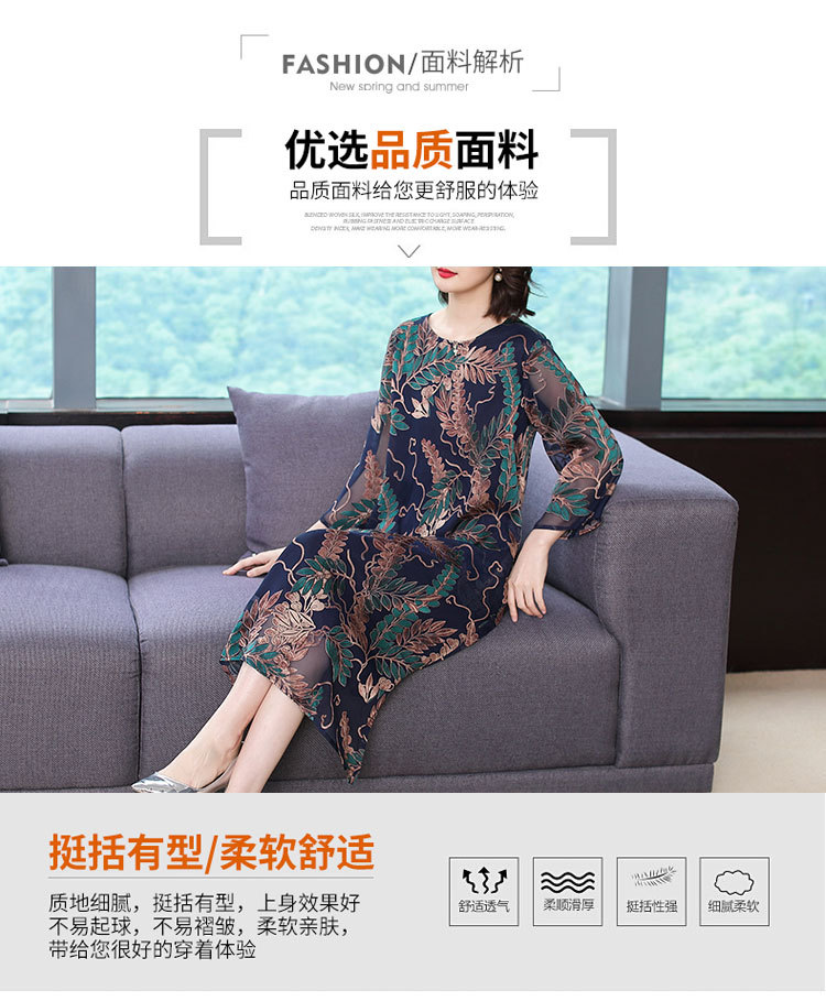 2019春夏新款復古媽媽裝印花連衣裙女氣質中長款寬松顯瘦過膝裙子