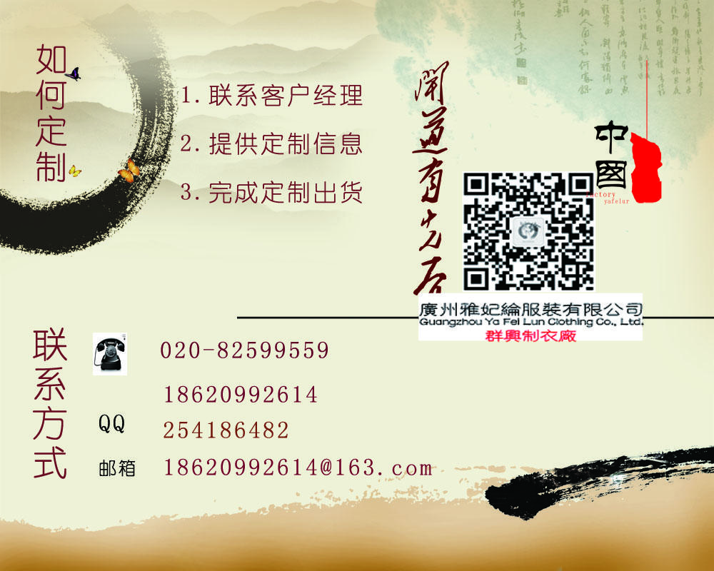廣州雅妃綸服裝有限公司是一家集設計、定做、制作為一體的廣告衫、運動服廠。我們是實體廠家,有自己的裁剪制作及印花車間。主要產品有:文化衫、廣告衫、勞保服、藍大褂、馬夾、廣告帽、運動服等各種勞保服飾。