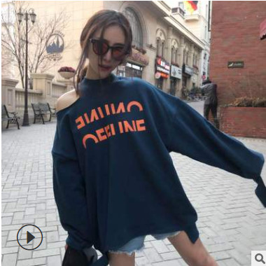 貞麒麟2018春季新款韓版女裝露肩衛衣字母破洞長袖女上衣一件代發