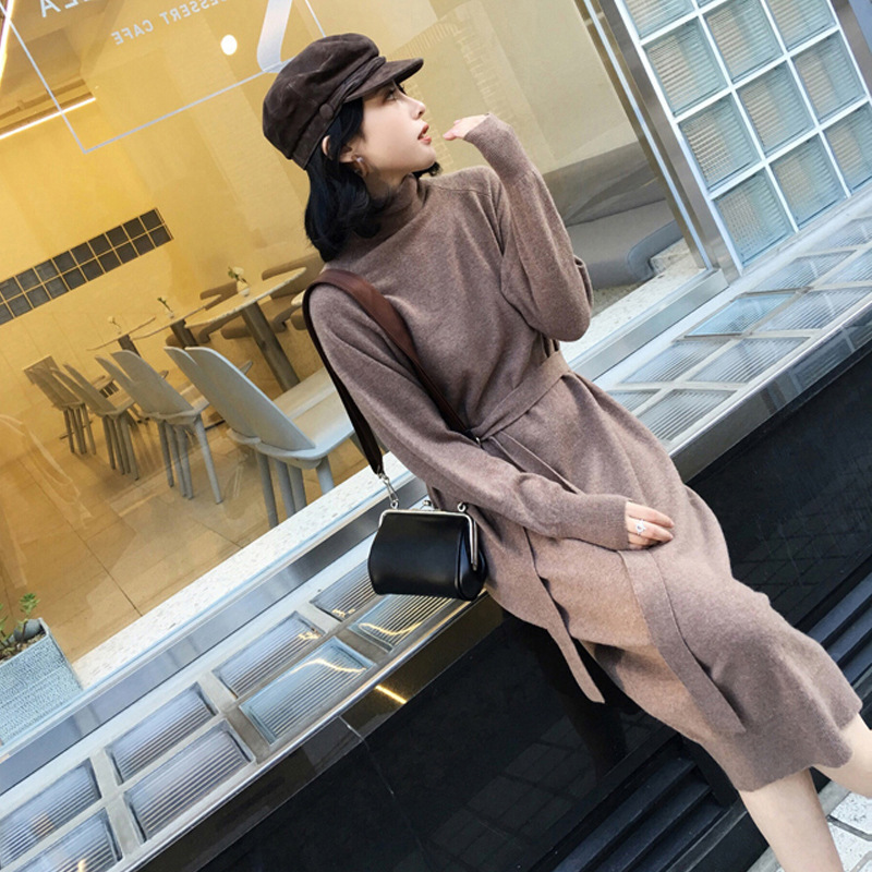 秋冬新款復古中長款毛衣裙寬松收腰高領打底針織連衣裙子女