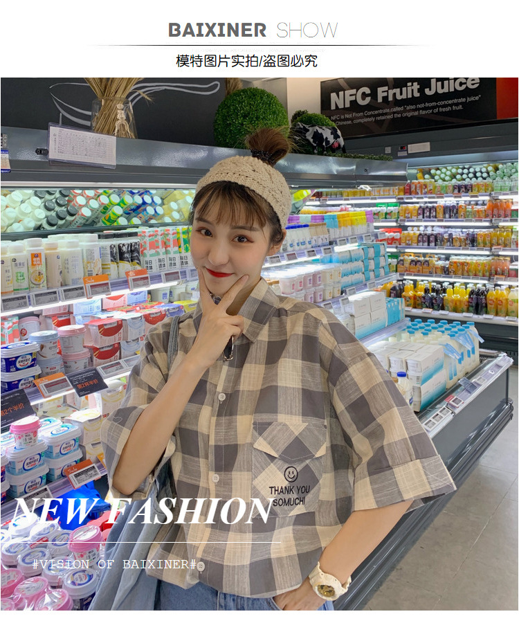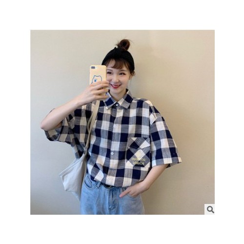 2021夏裝新款韓版超火學院風寬松格子襯衫學生中長款短袖上衣襯衣