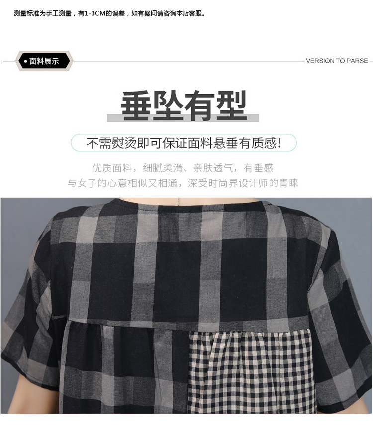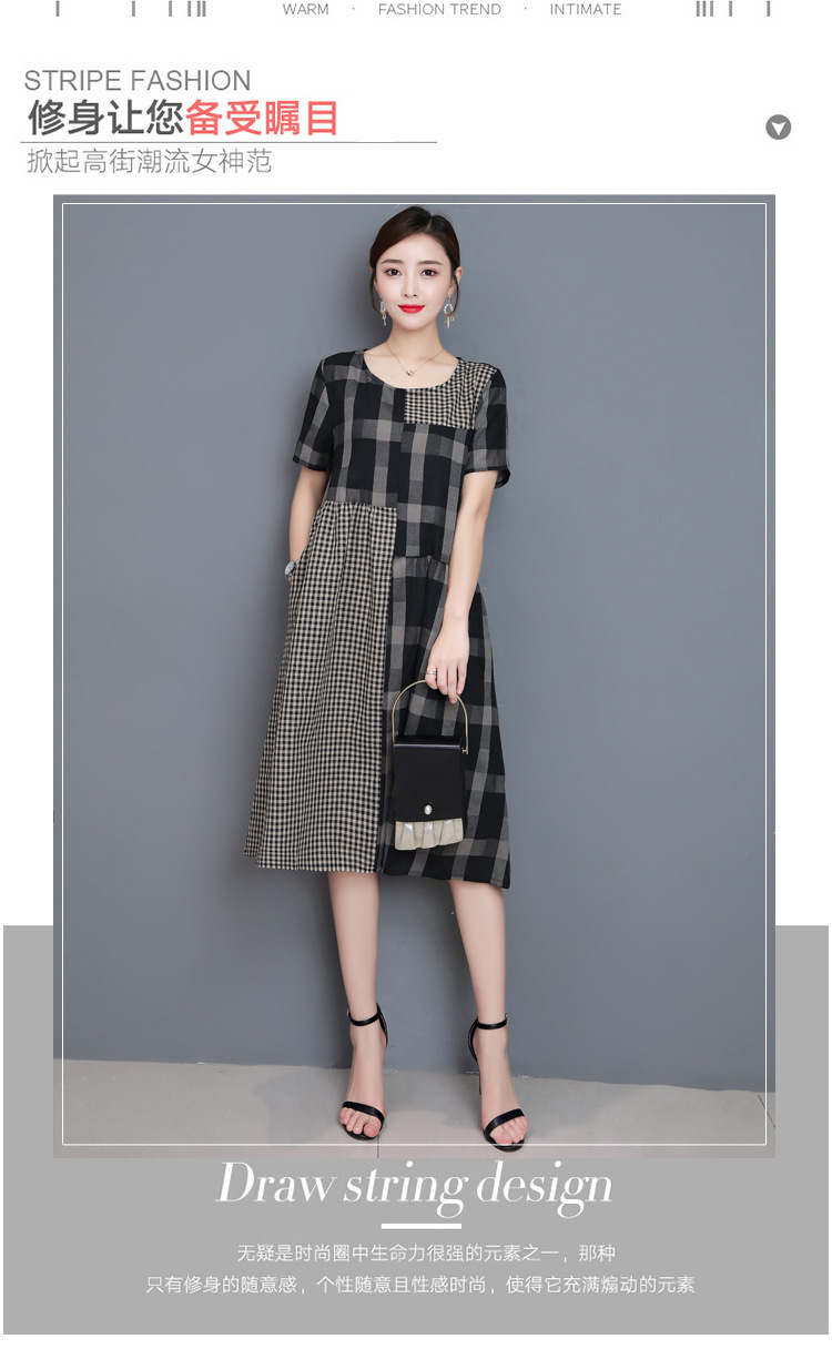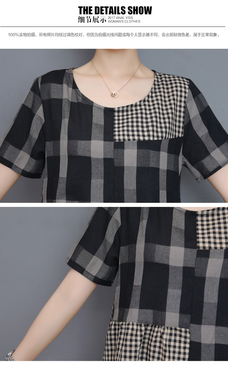 文藝拼接格子棉麻寬松圓領短袖連衣裙女中長款裙2019夏季新款實拍