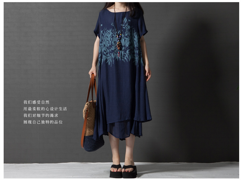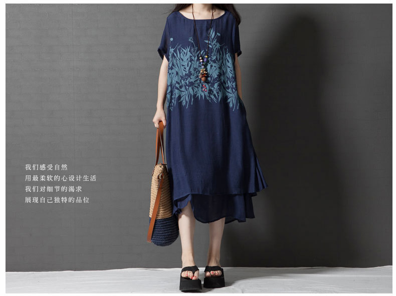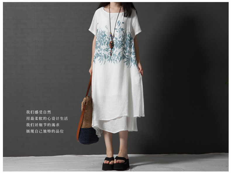 韓版寬松棉麻印花圓領短袖連衣裙女假兩件中長款裙子2019夏季新款
