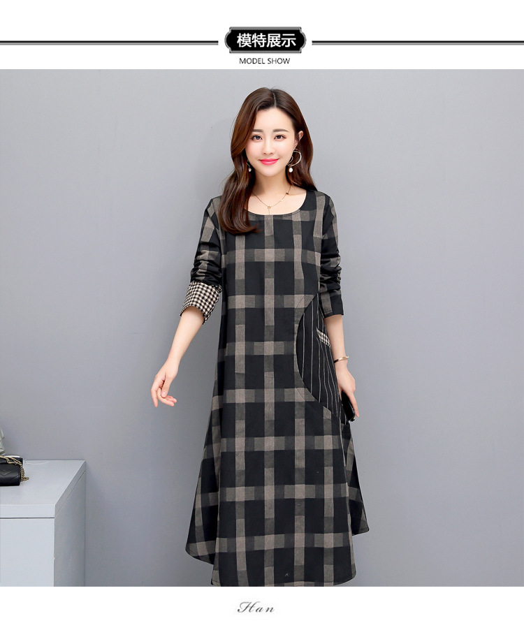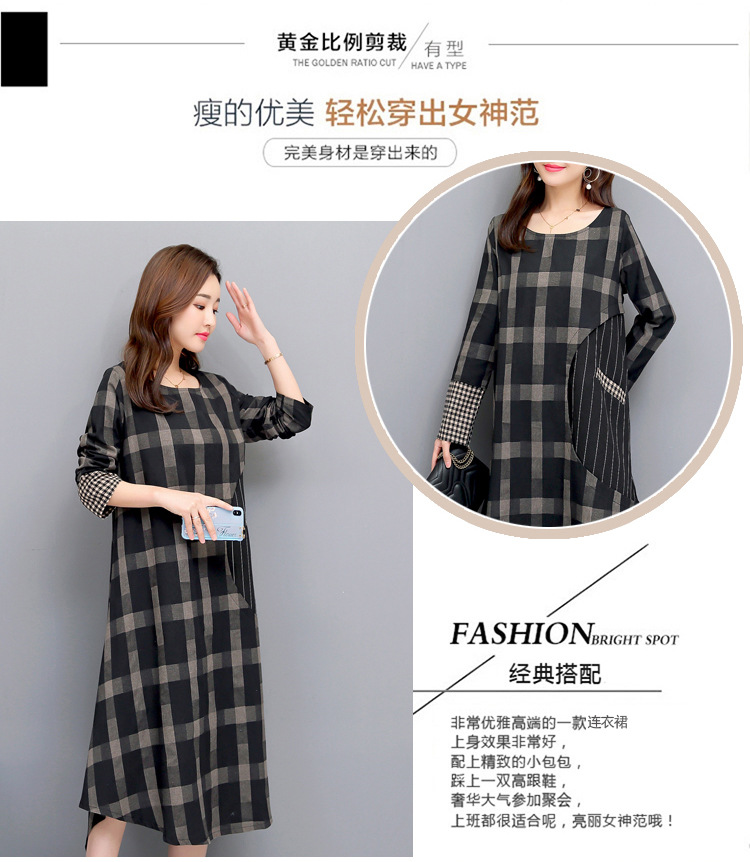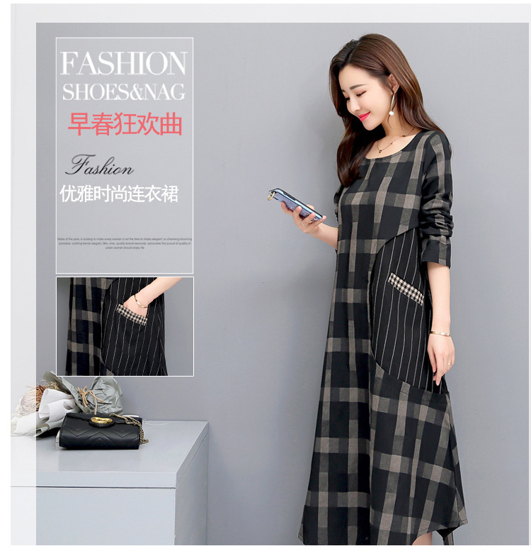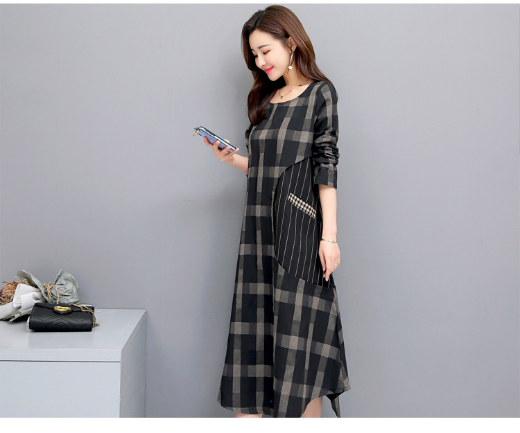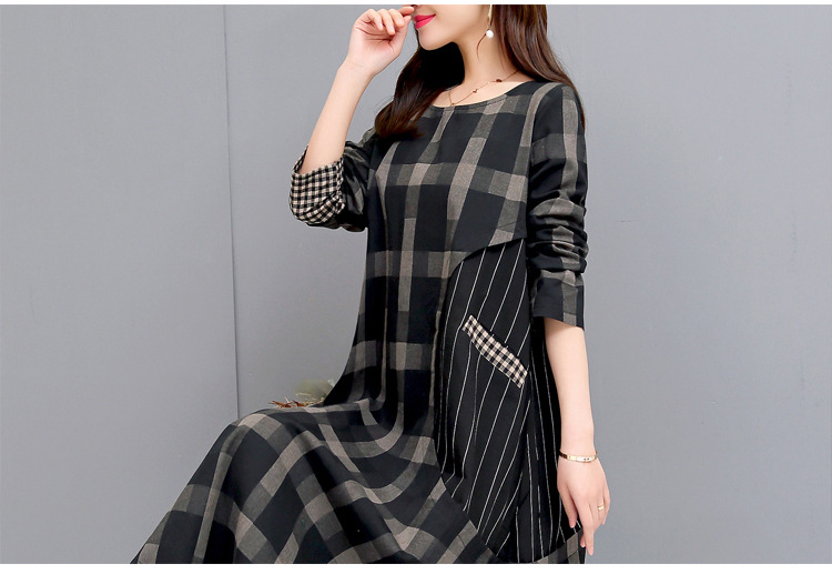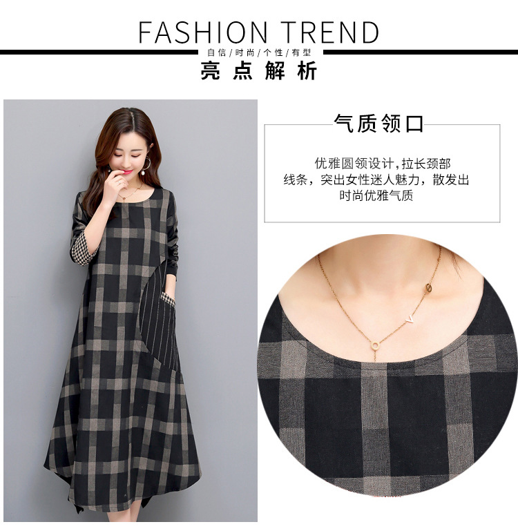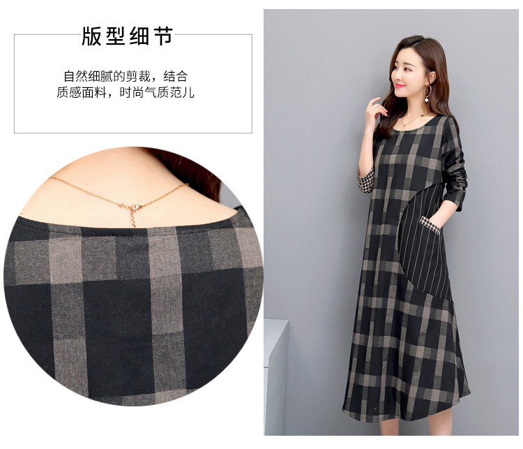 韓版寬松拼接格子棉麻圓領長袖連衣裙女裝中長款2019秋季新款實拍