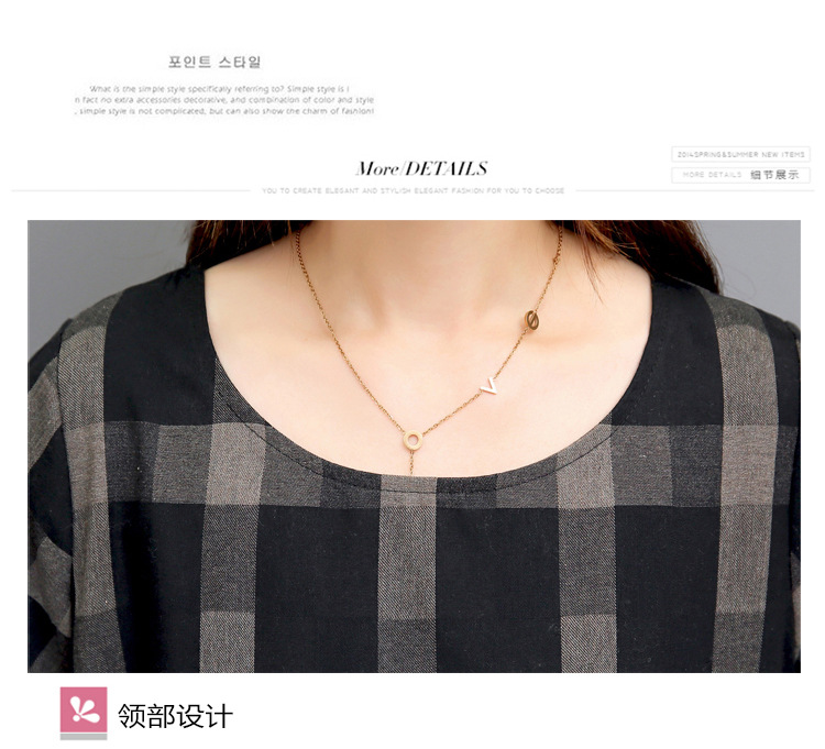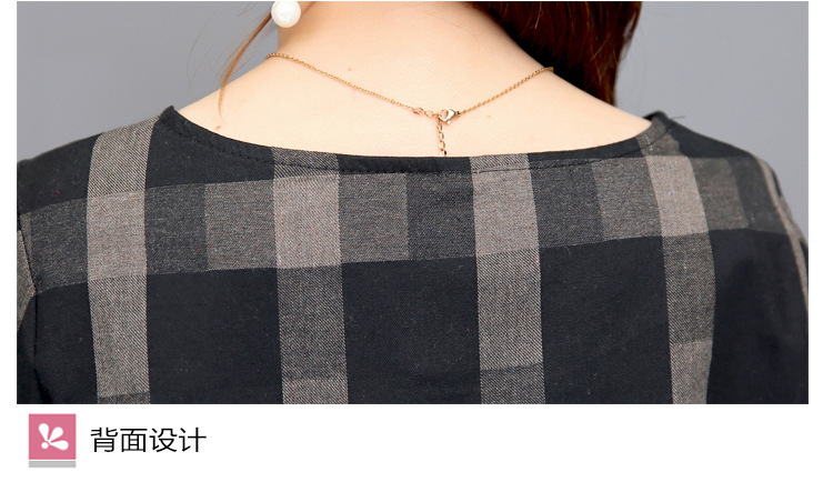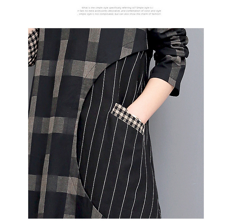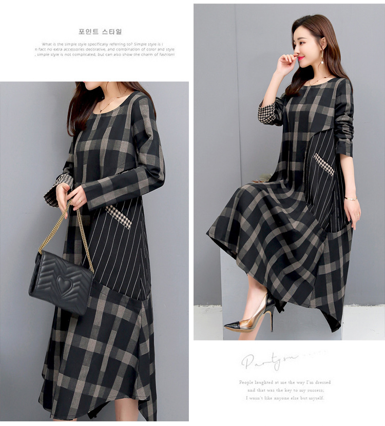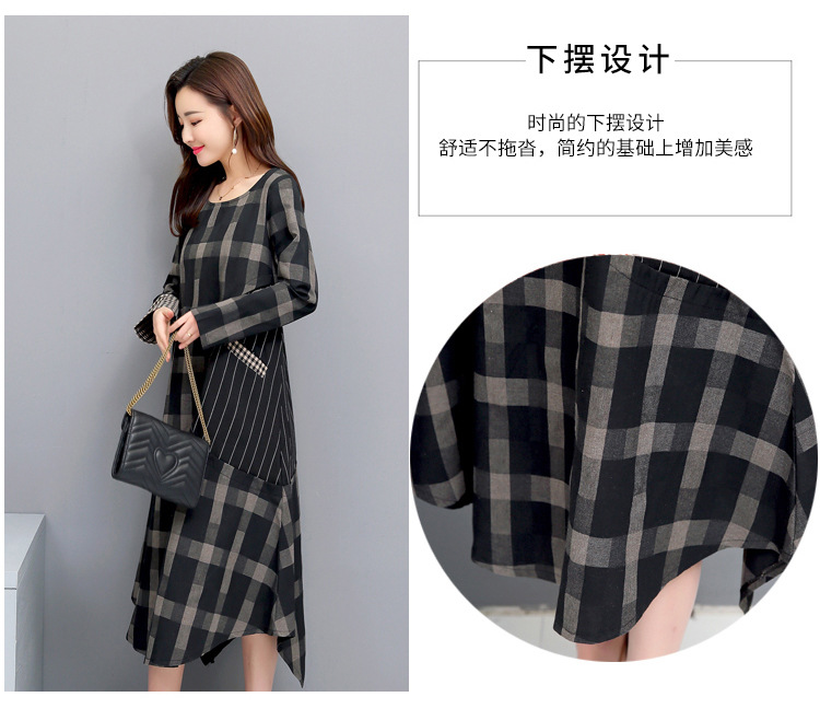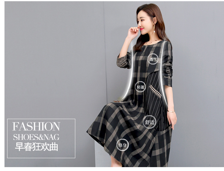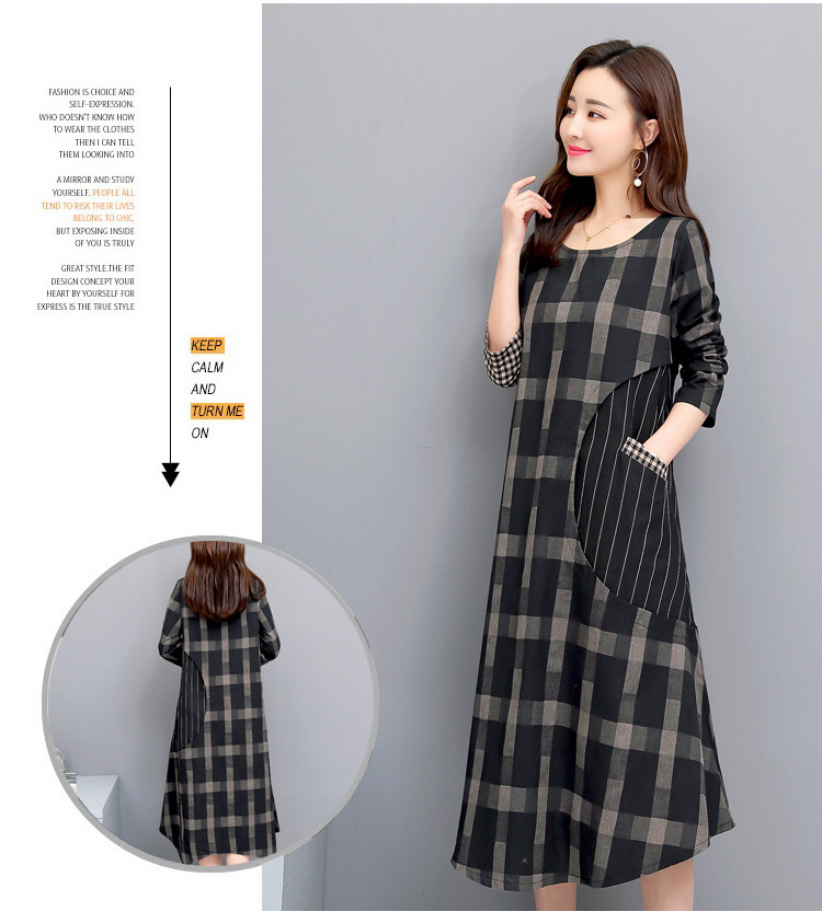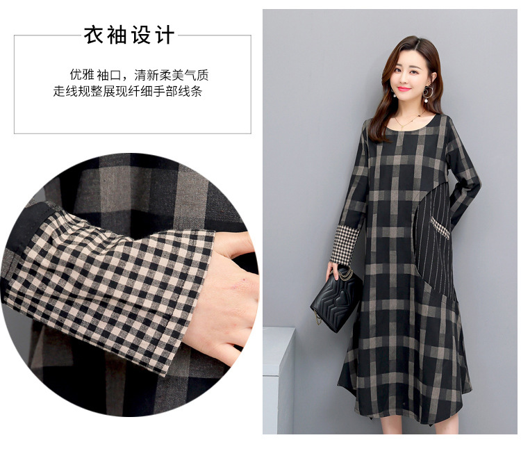 韓版寬松拼接格子棉麻圓領長袖連衣裙女裝中長款2019秋季新款實拍