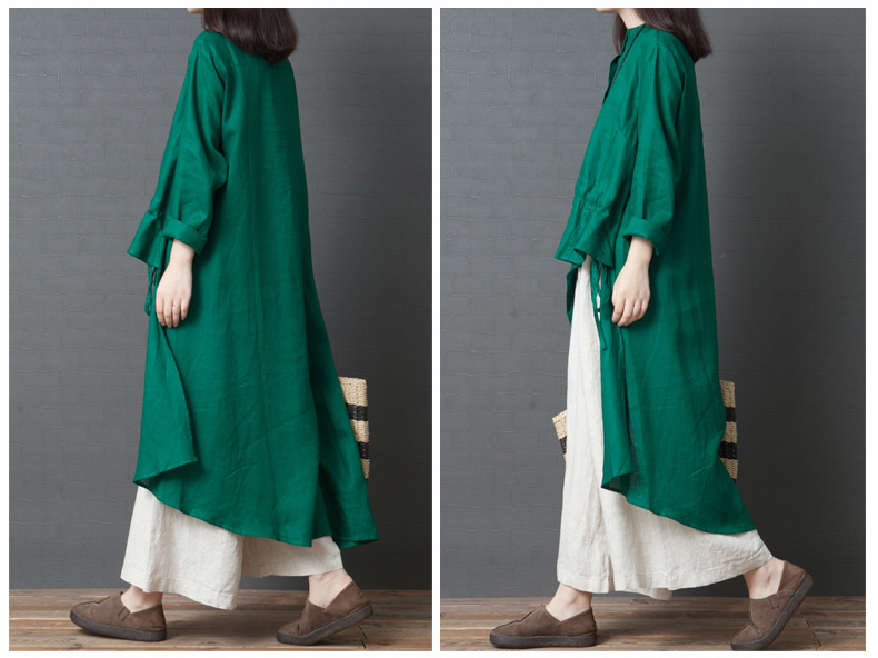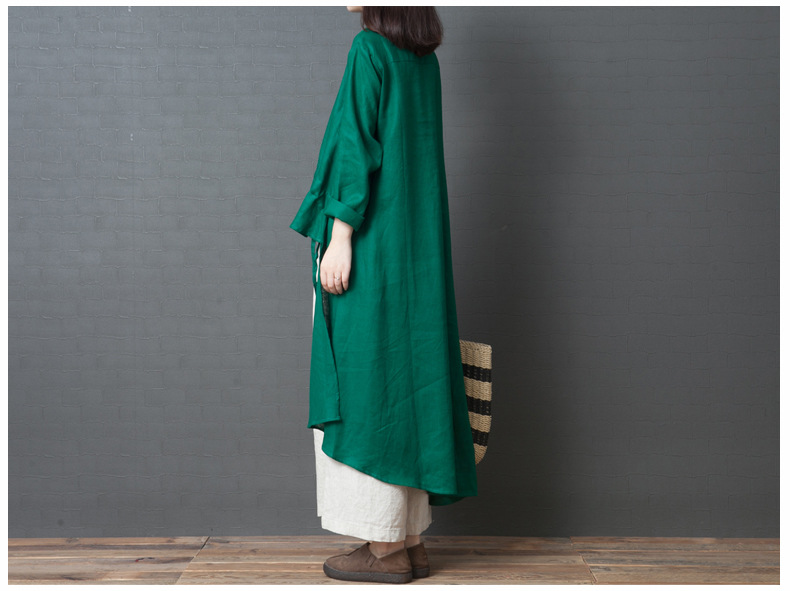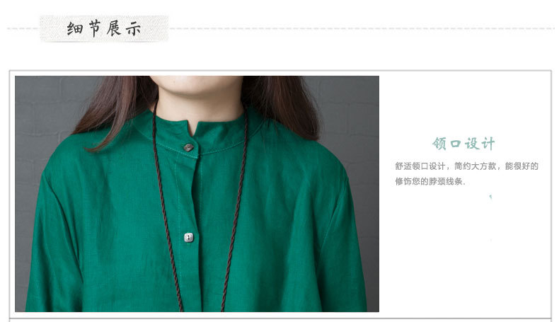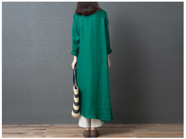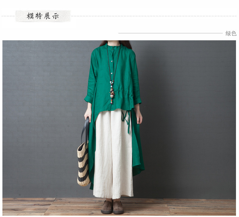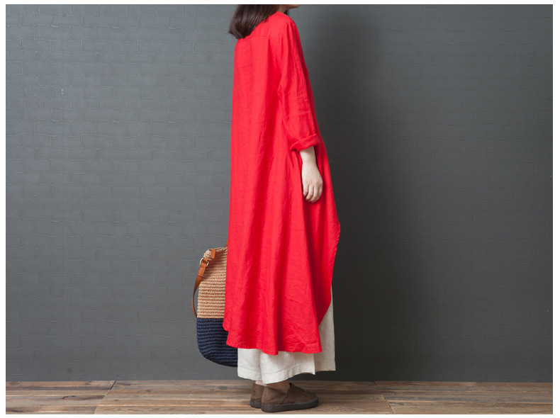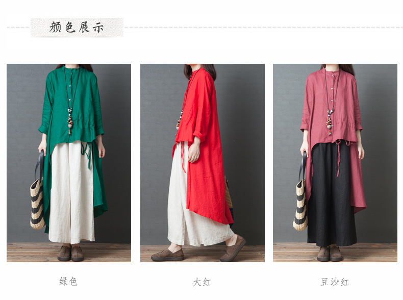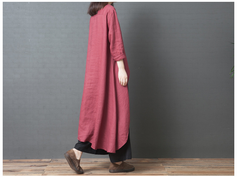 春裝女2019新款大碼女裝時尚氣質棉麻純色民族風長袖連衣裙中長款
