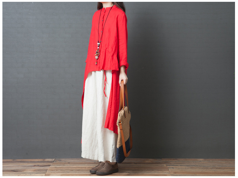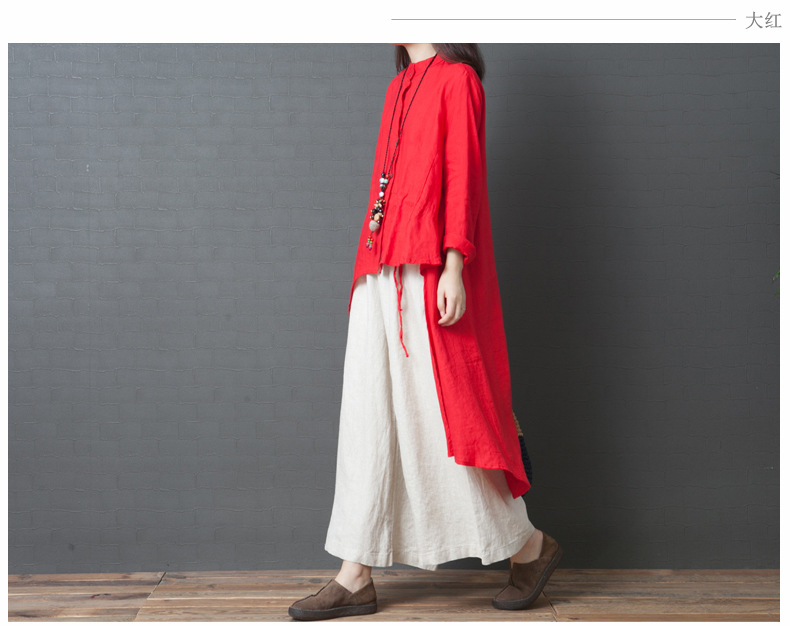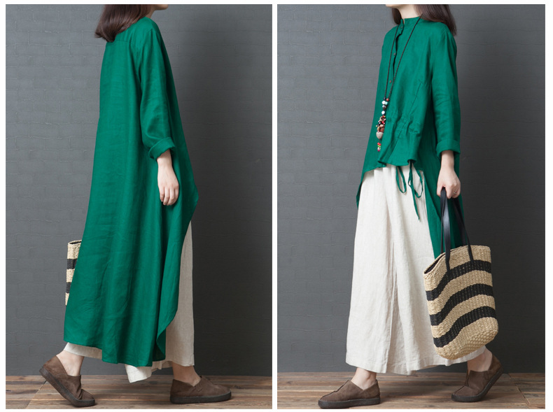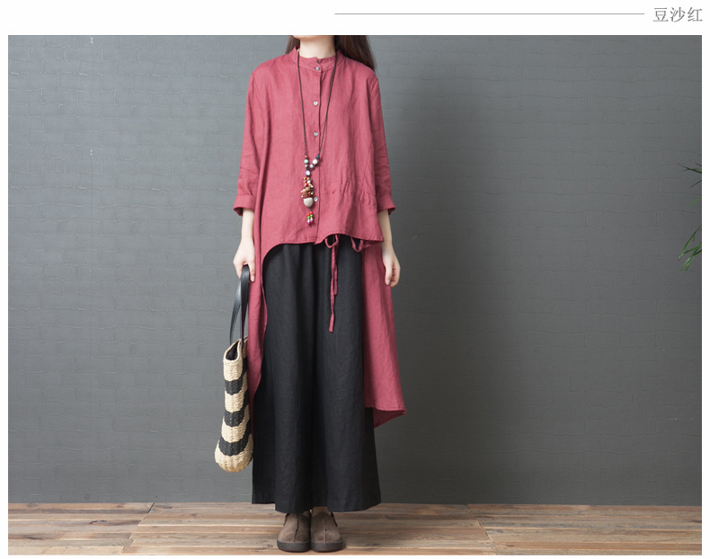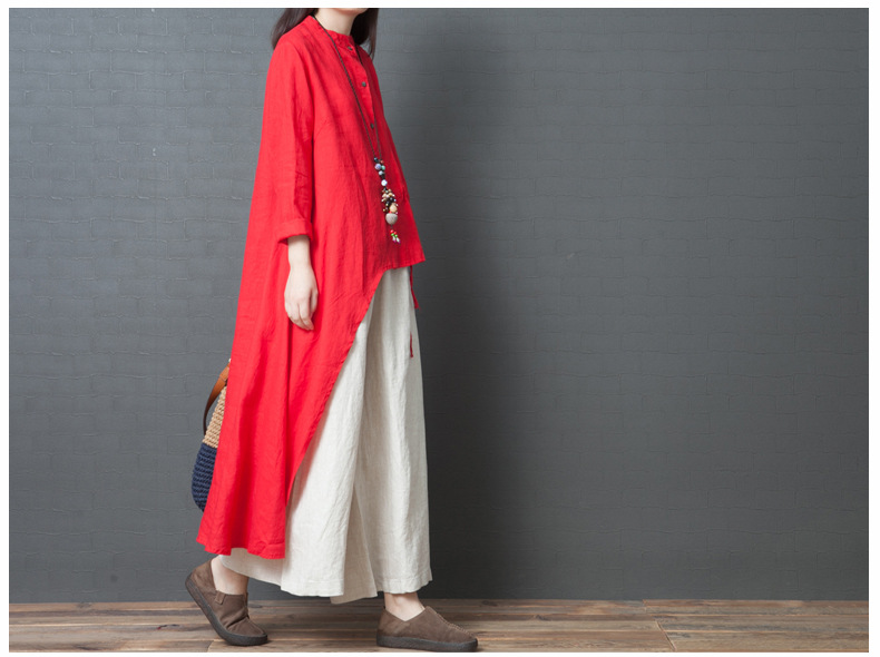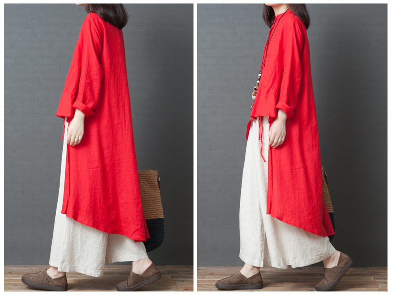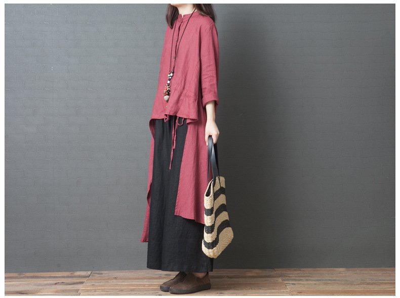 春裝女2019新款大碼女裝時尚氣質棉麻純色民族風長袖連衣裙中長款
