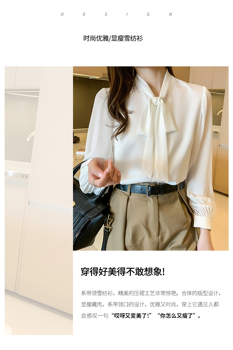 蝴蝶結職業裝白色襯衫女2021春季新款飄帶領長袖寬松洋氣雪紡上衣