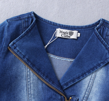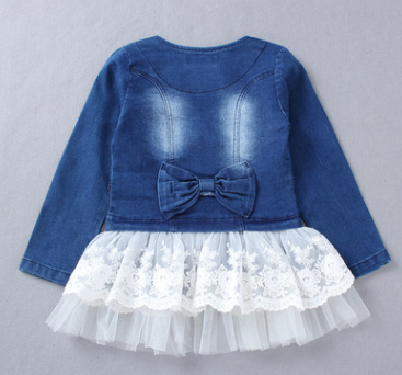 女童中長款牛仔外套 中大童蝴蝶結翻領牛仔風衣蕾絲裙擺 一件代發