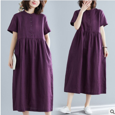 夏裝新款大碼女裝文藝復古棉麻寬松大碼長款短袖純色連衣裙子