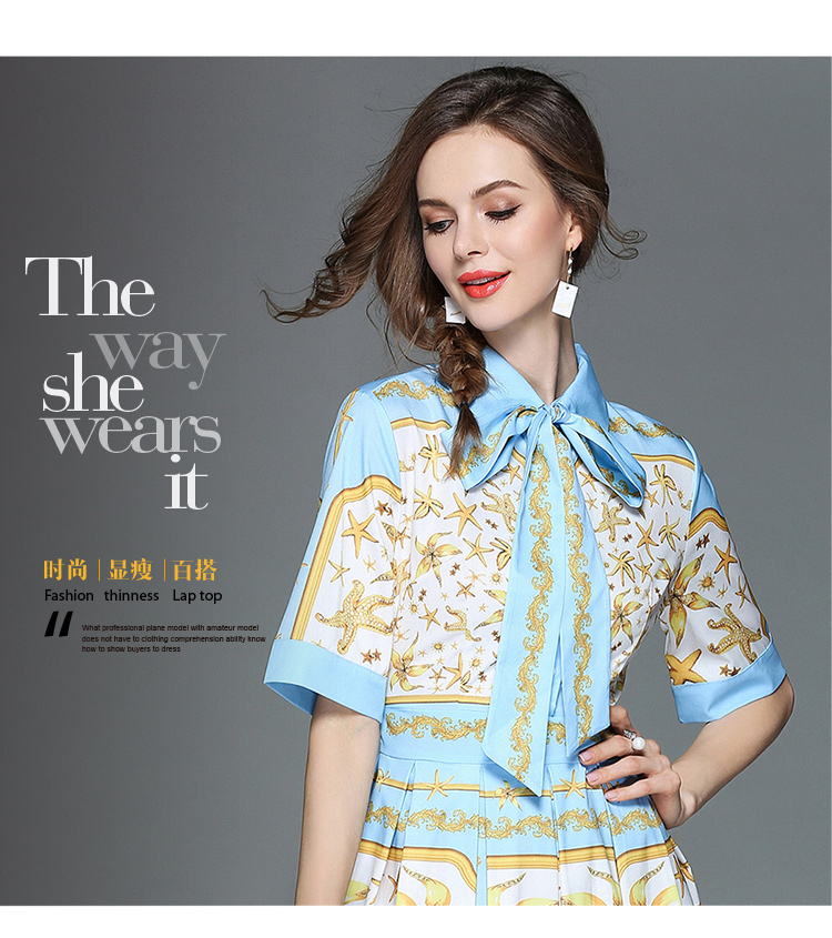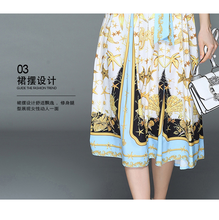 2018女裝翻領長袖精美印花收腰系帶大擺型修身長裙連衣裙