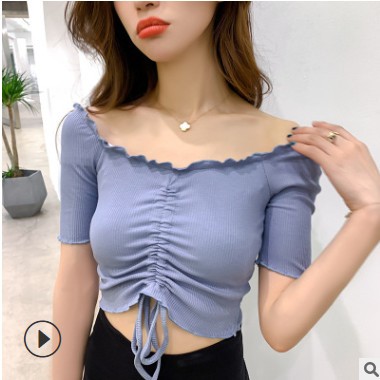 2020秋季新款女裝復古修身一字領抽繩上衣短款性感顯瘦短袖T恤