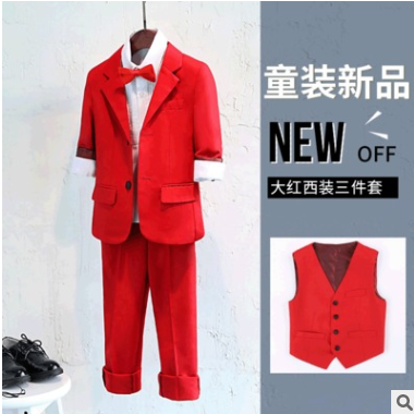 大紅色男童西裝三件套婚禮花童西裝套裝可定制一件代發