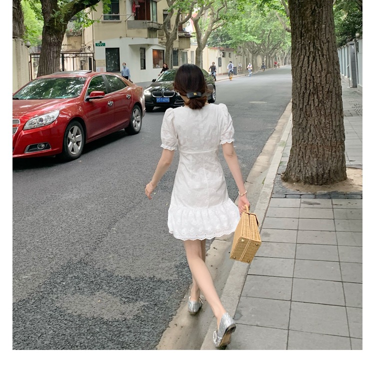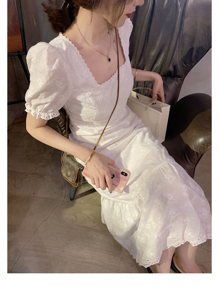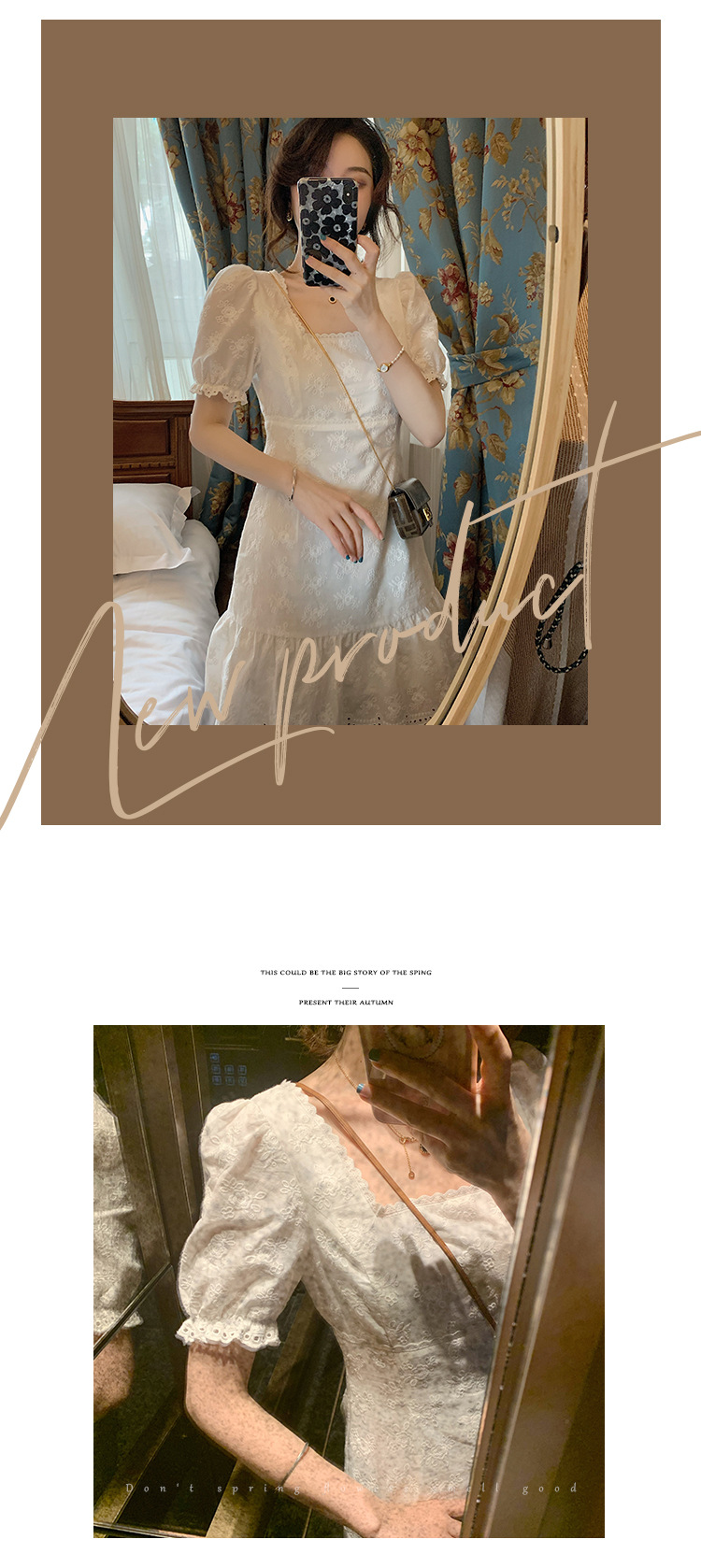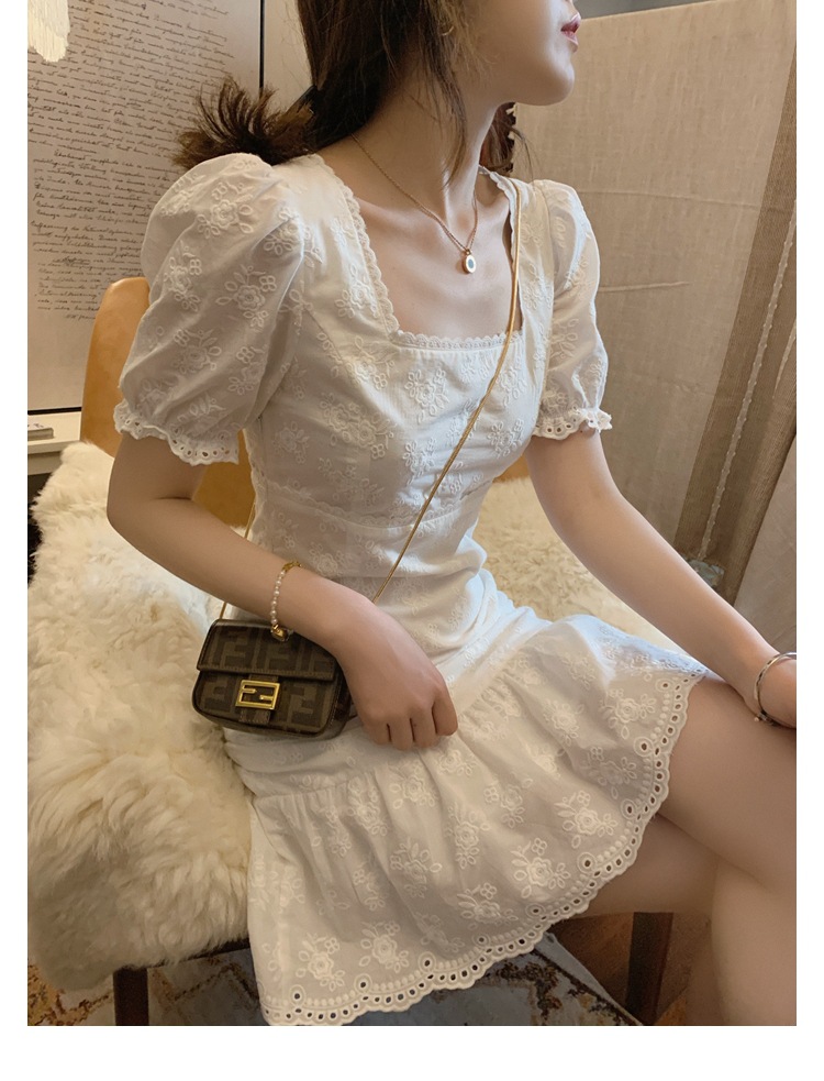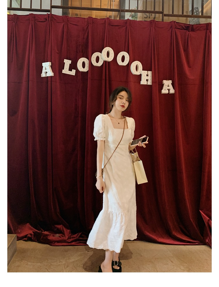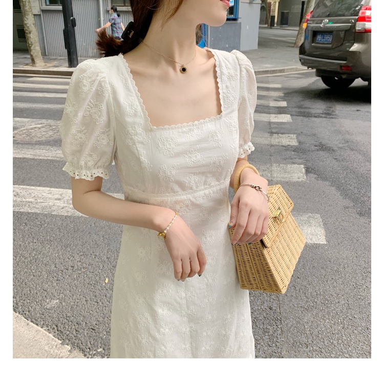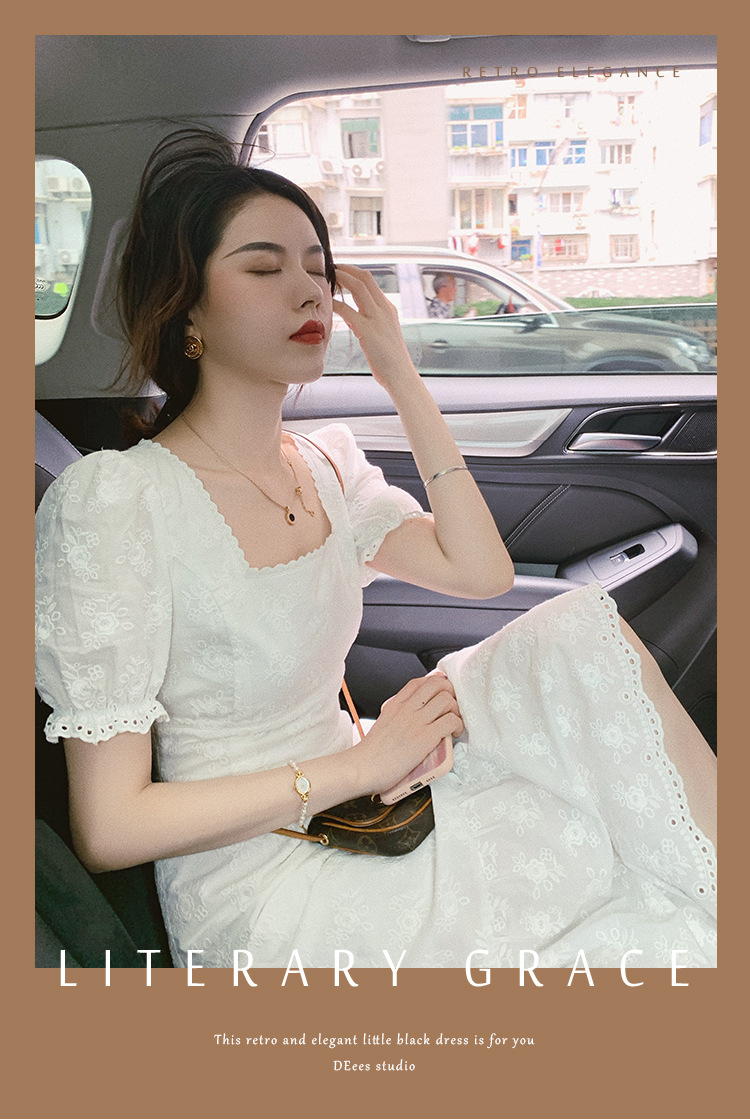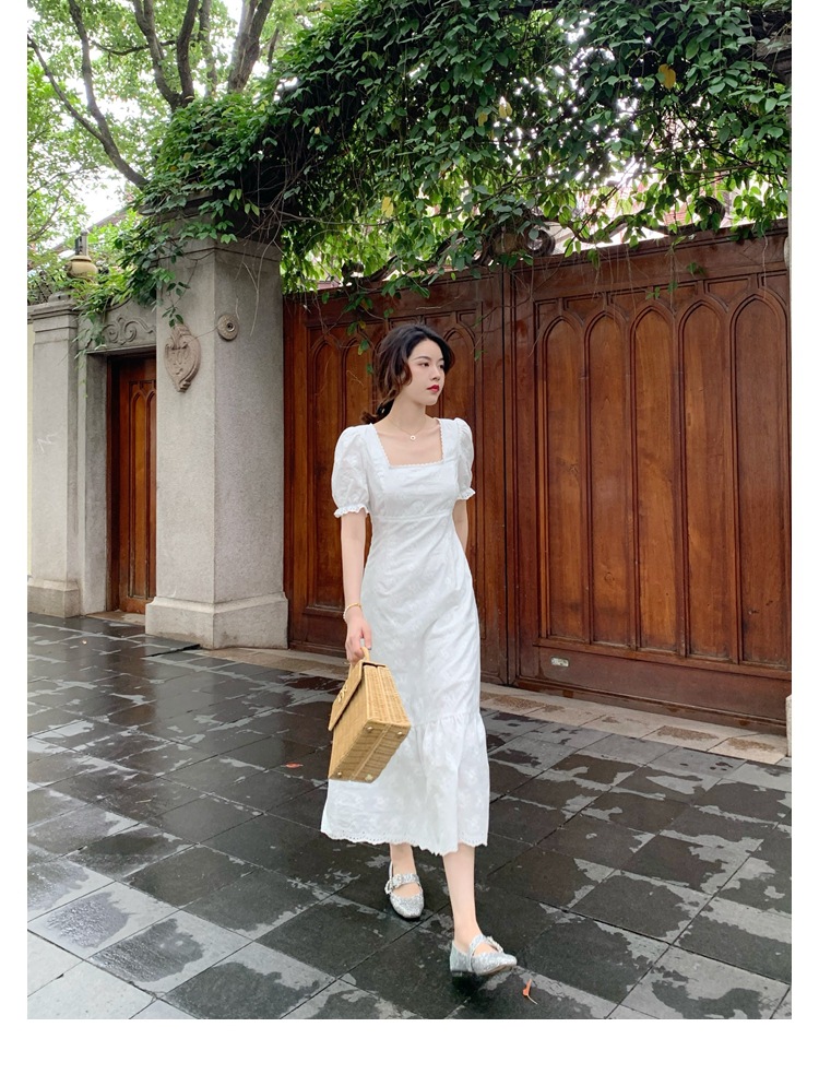 大Eees 法式白玫瑰定位刺繡方領(lǐng)連衣裙女夏白色高腰魚尾裙 長短款