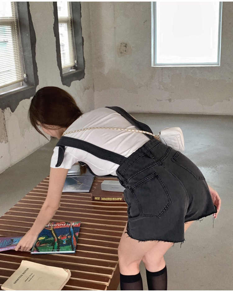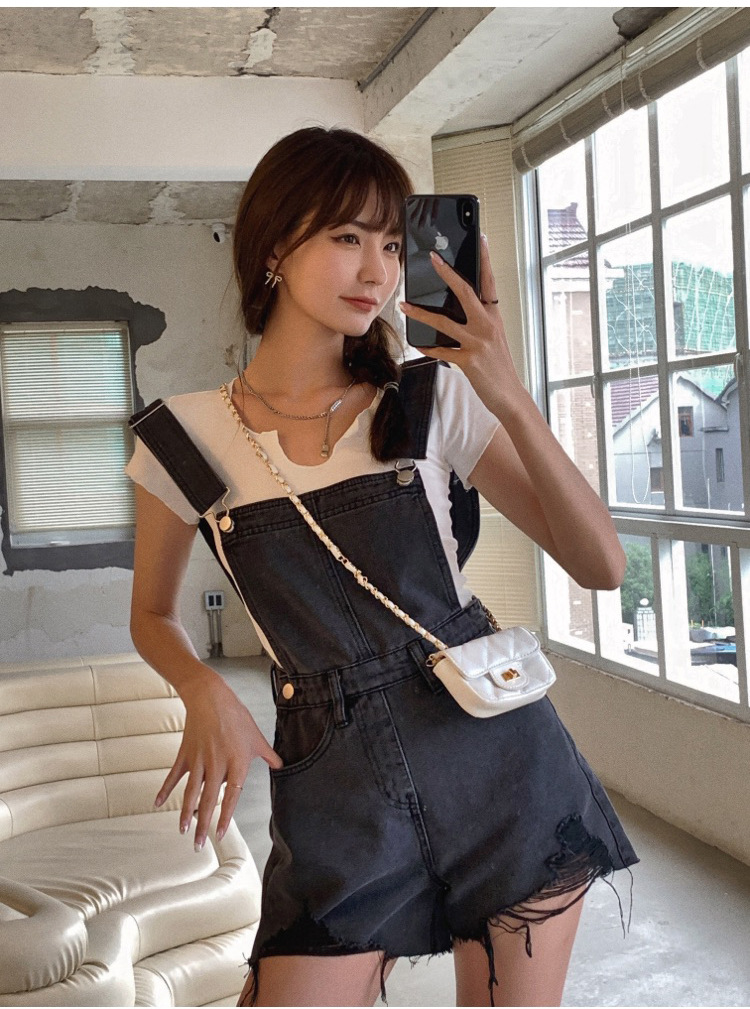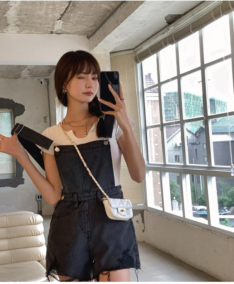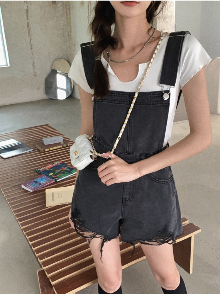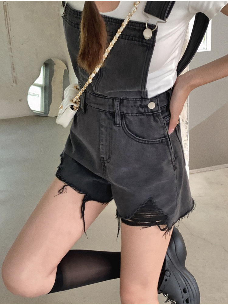 2021牛仔背帶褲女韓版寬松短褲2021新潮顯瘦直筒高腰磨破褲子夏