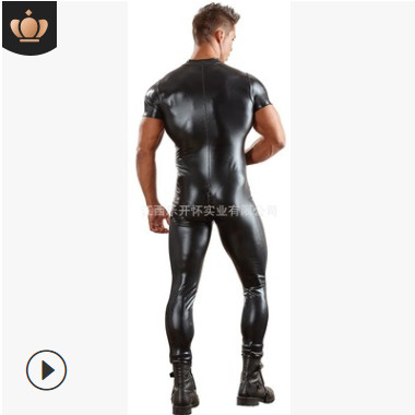歐美性感男士漆皮緊身連體衣雙拉鏈頭開(kāi)襠夜店舞臺(tái)ds演出服短袖裝