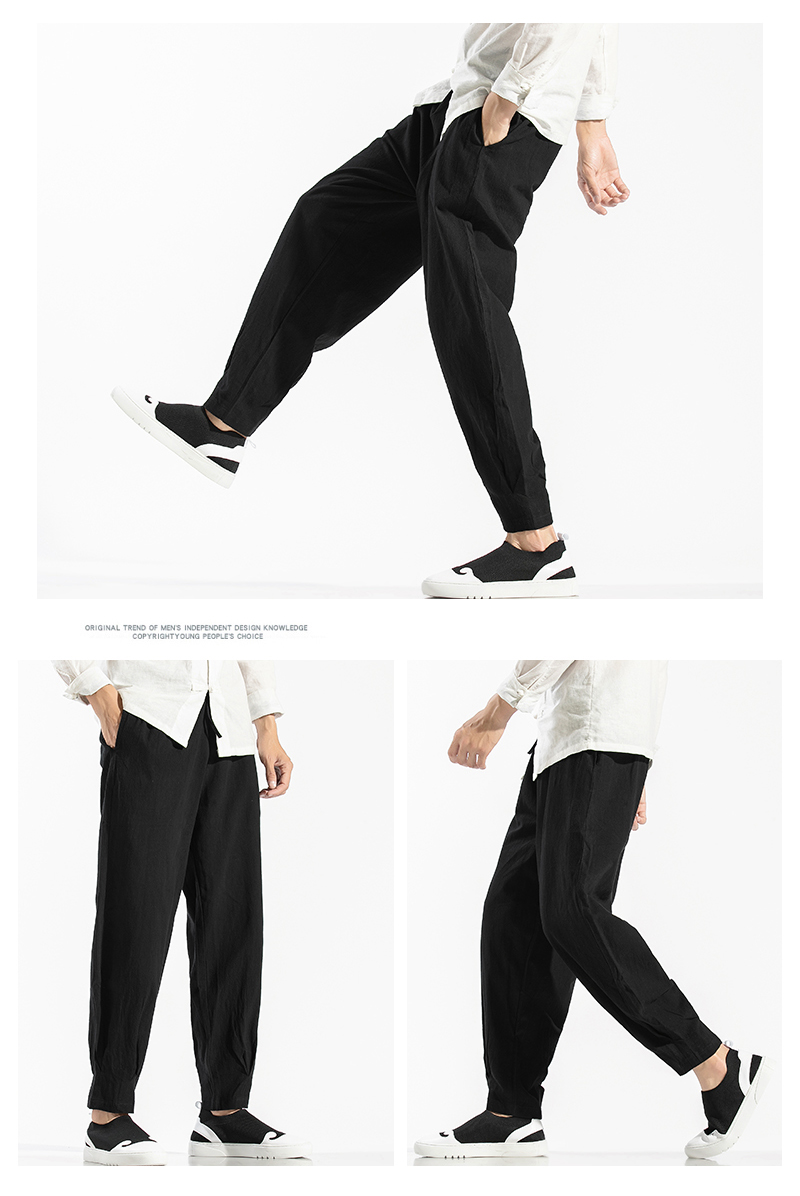 2019秋季新款男裝中國風大碼小腳褲純色百搭休閑松緊腰棉麻褲子