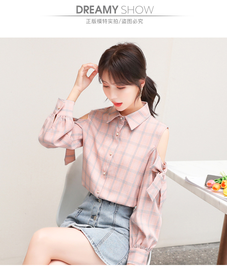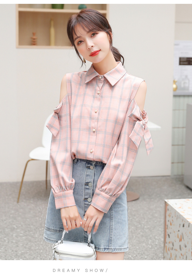 實拍2020秋裝新款女裝 韓版格紋襯衣女開衫蝴蝶結露肩雪紡衫上衣