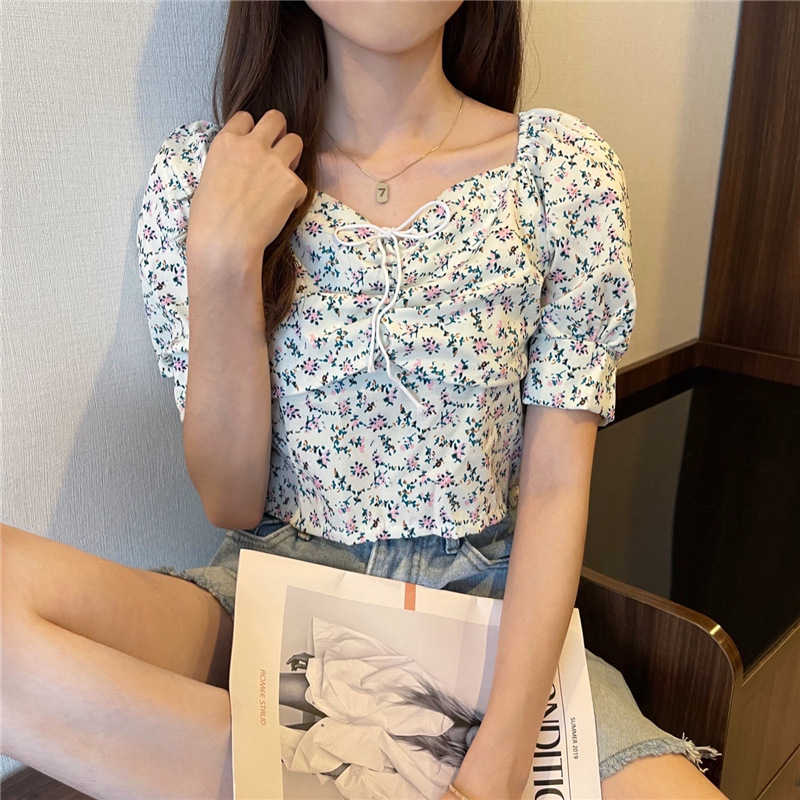 一件代發2021新款復古氣質小碎花方領系帶泡泡袖顯瘦短款上衣女