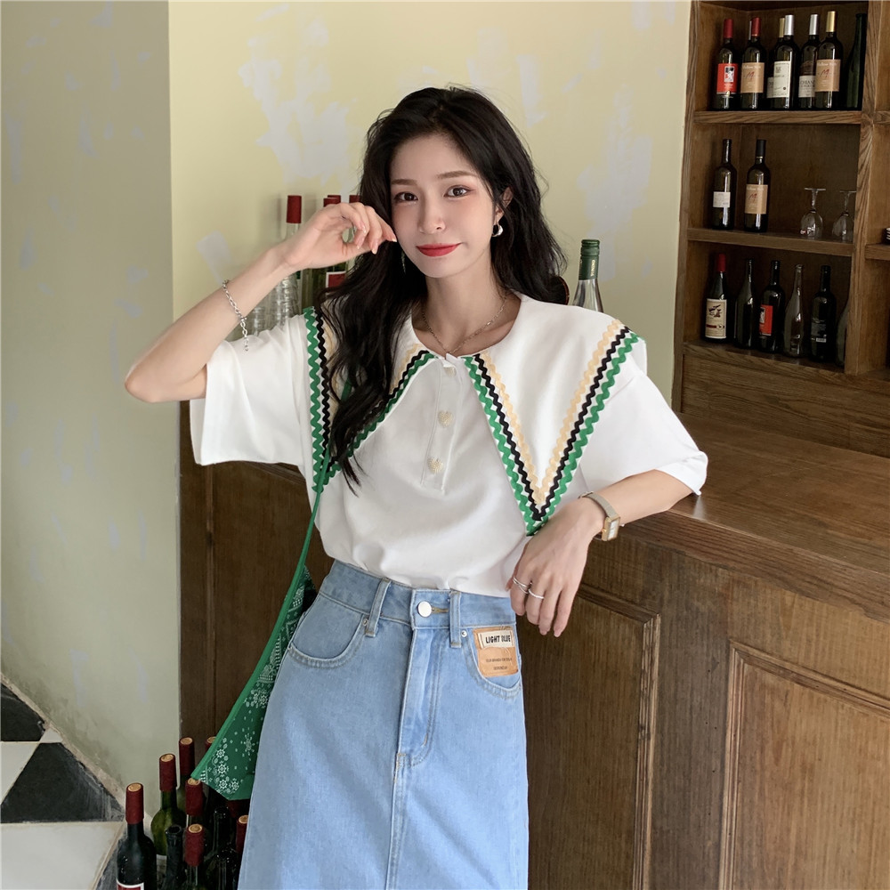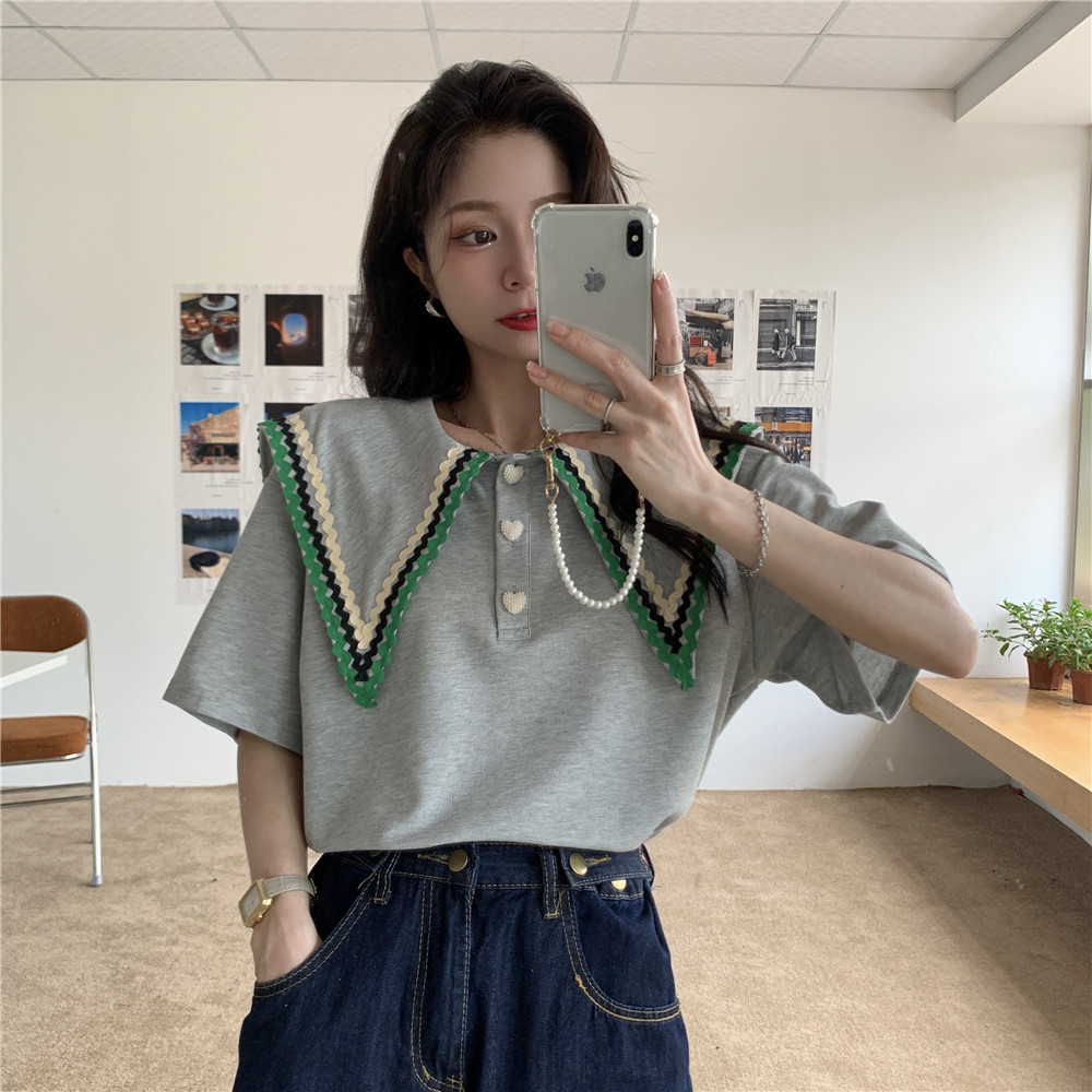 海軍娃娃領(lǐng)短袖T恤女裝夏季2021新款日系學(xué)院風(fēng)鹽系衣服寬松上衣