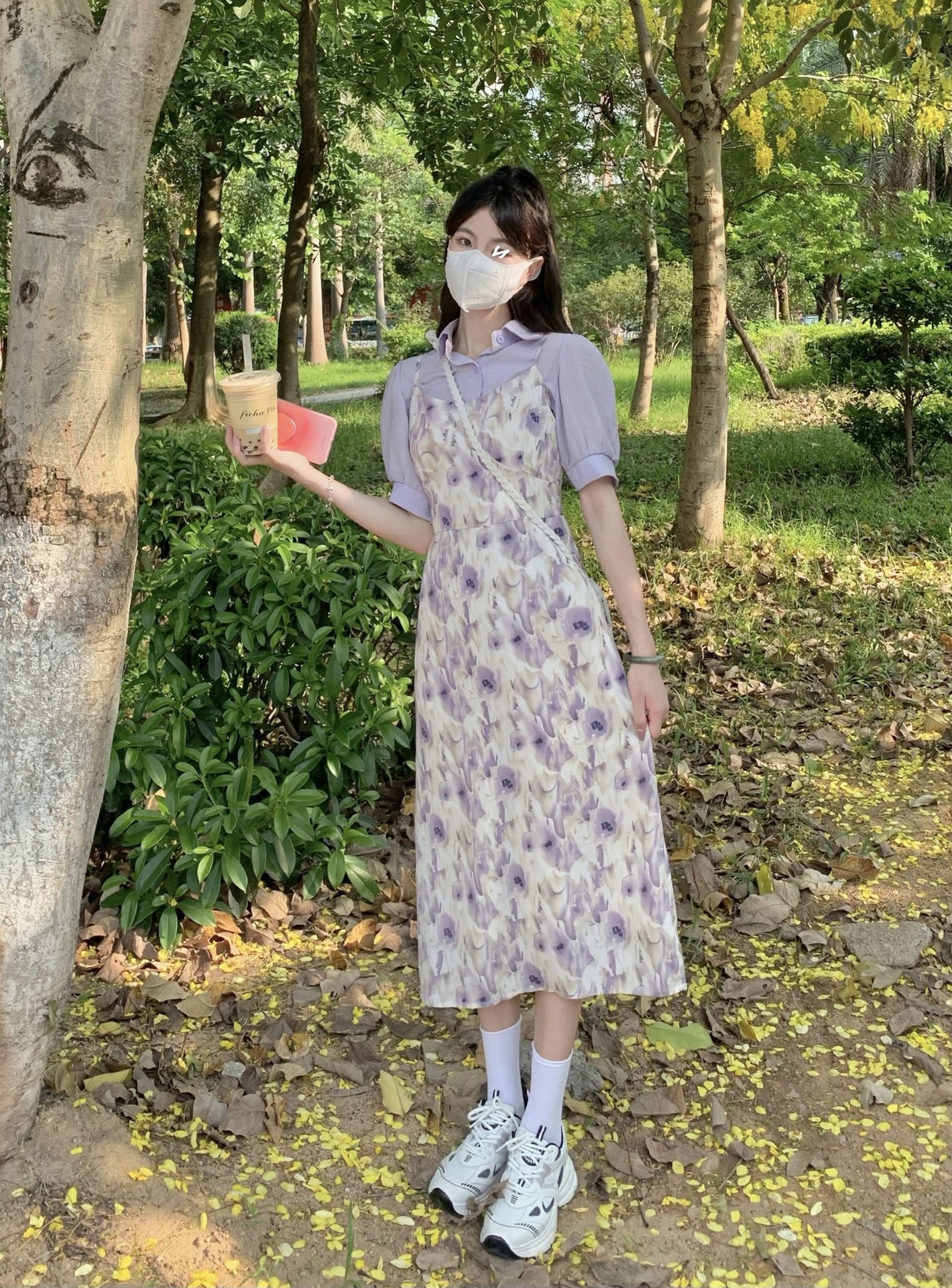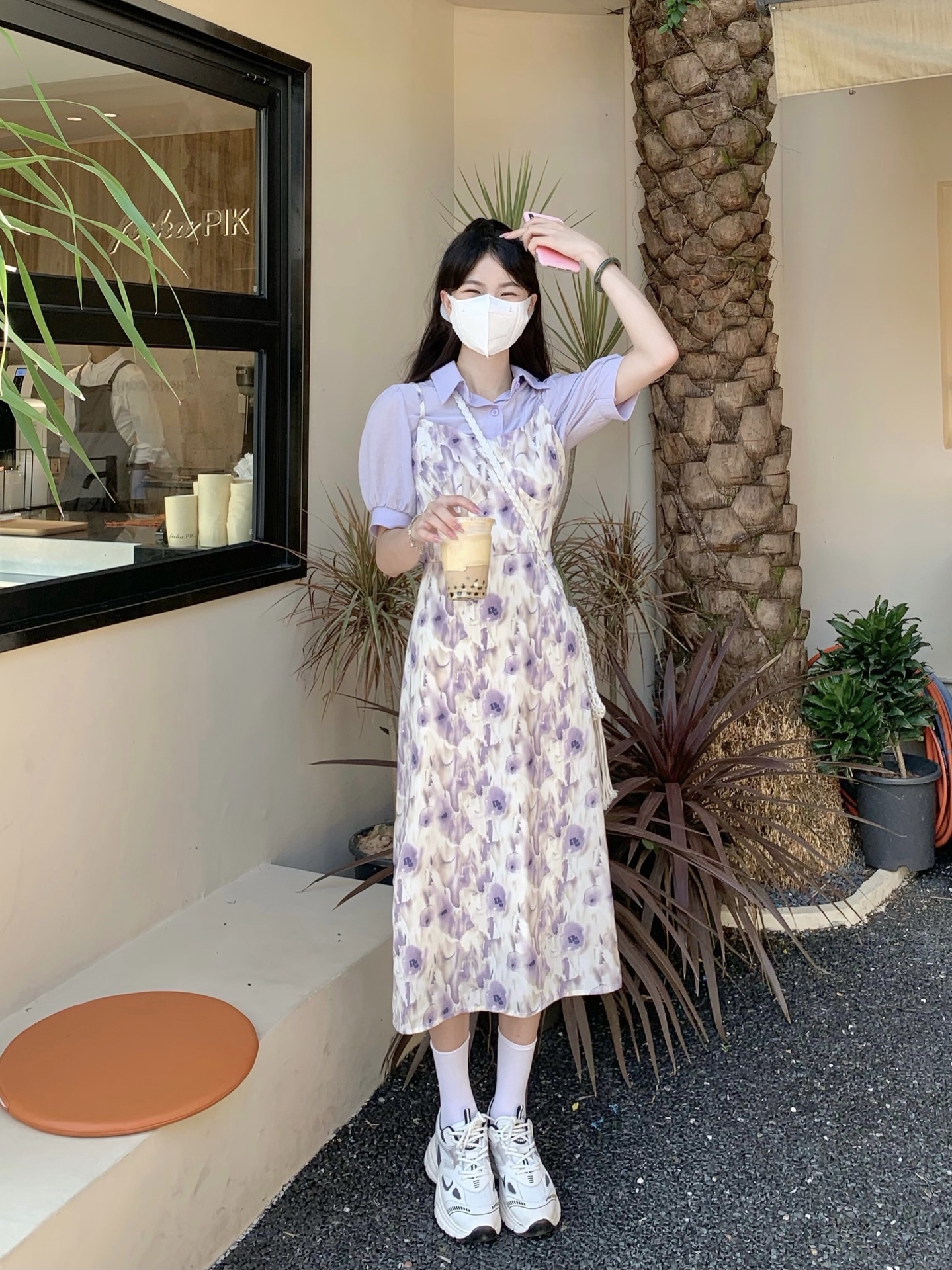 工廠直供2021新款時尚水墨畫吊帶裙+圓領短款防曬襯衫兩穿套裝女