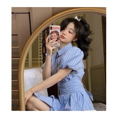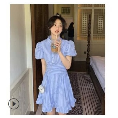 條紋泡泡袖polo連衣裙子女2021新款小個子時尚荷葉邊收腰襯衫裙