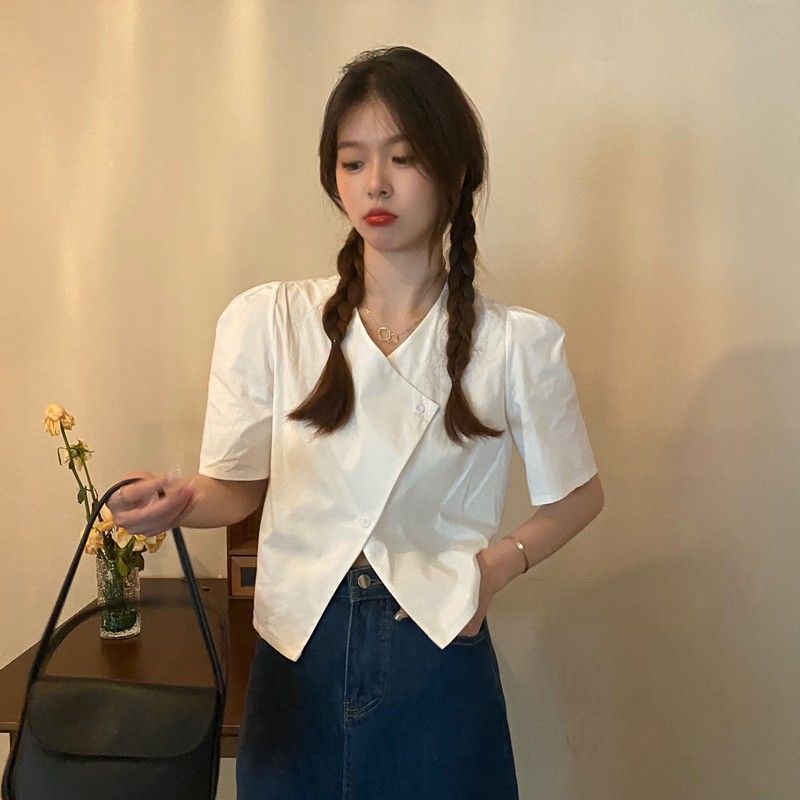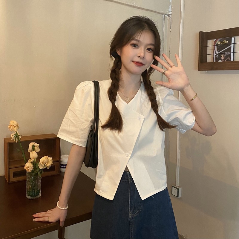 工廠直供實拍2021新款韓版設計感V領不規則系扣寬松泡泡袖襯衫