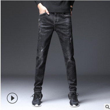 高端貼布繡花破洞小腳牛仔褲男式韓版彈力修身棉質(zhì)青少年長牛仔褲