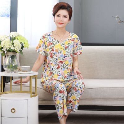 中老年媽媽睡衣春夏季新款短袖長褲加特大碼人造棉棉綢家居服套裝