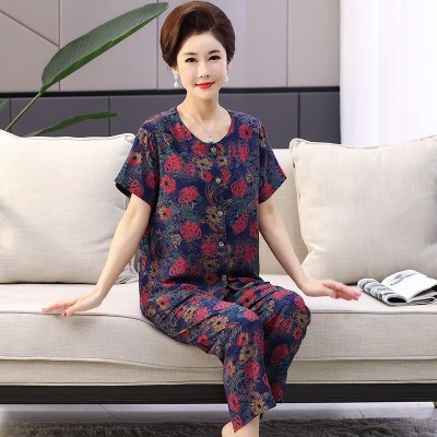 中老年媽媽睡衣數(shù)碼印短袖長褲全人造棉綢家居服碎花紐扣開衫套裝