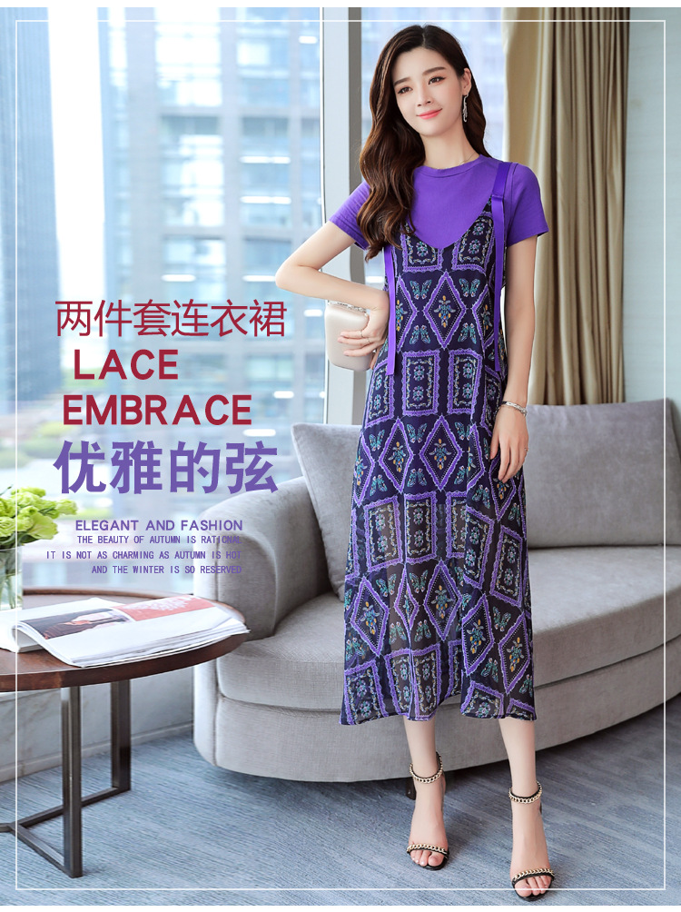 歐洲站印花雪紡連衣裙女夏新款韓版過膝長裙吊帶裙兩件套裝裙